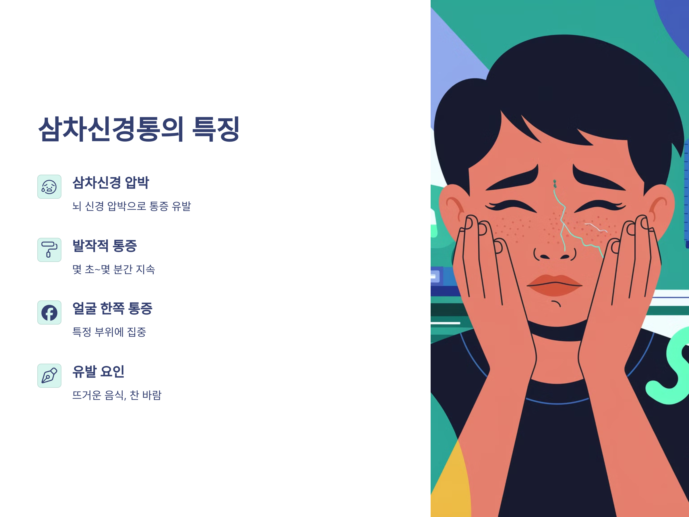 - 얼굴의 한쪽에서 발생하는 극심한 통증