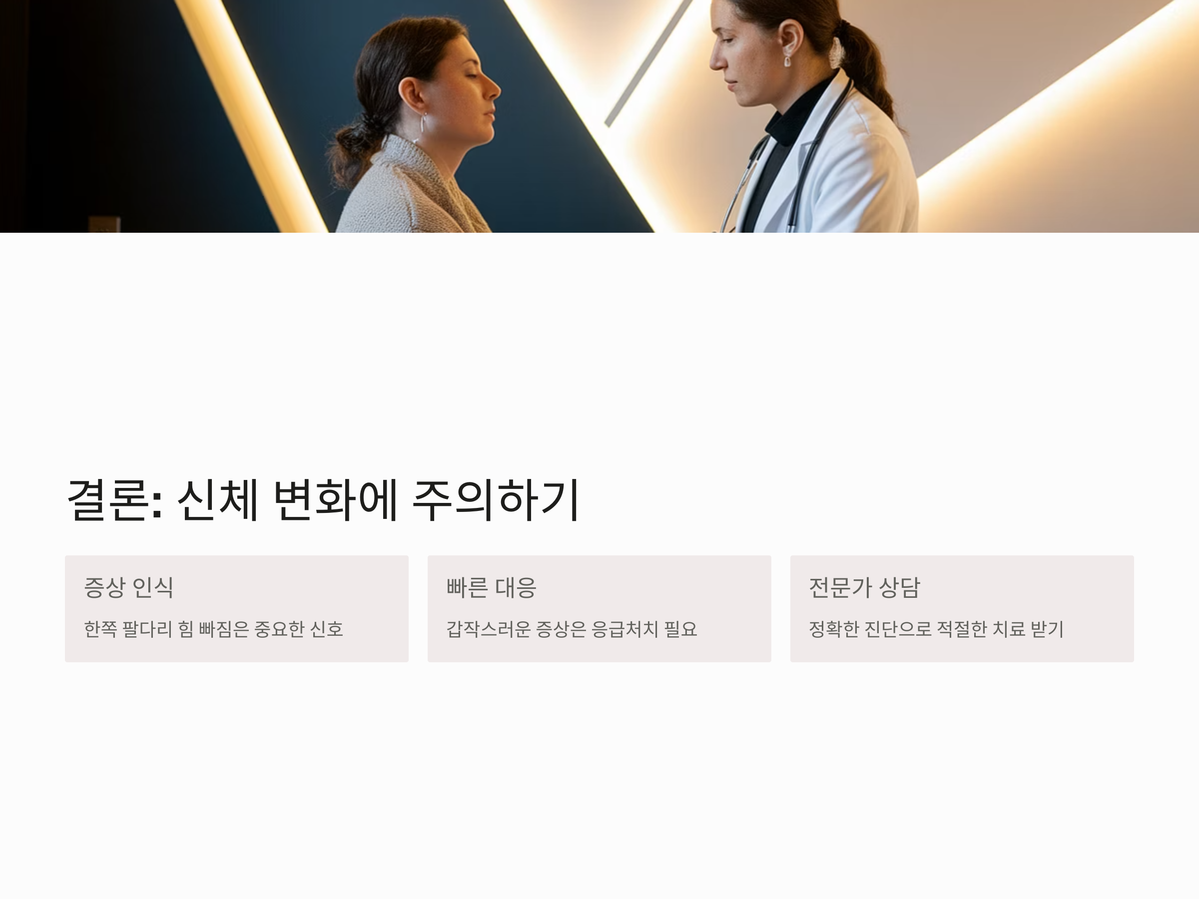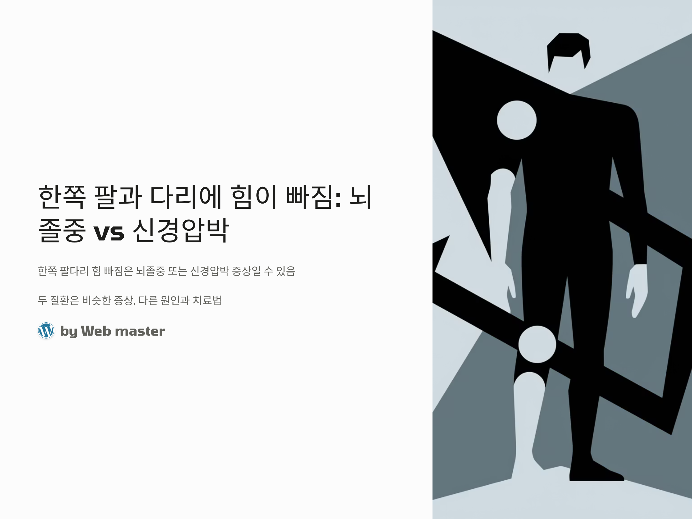 한쪽 팔과 다리에 힘이 빠지는 증상은 매우 중요한 신호일 수 있으며, 그 원인에 따라 적절한 대응이 필요합니다. 뇌졸중과 신경압박은 비슷한 증상을 보일 수 있지만, 발생 원인과 치료 방법이 크게 다르기 때문에 증상의 변화나 진행 속도에 따라 정확한 진단을 받아야 합니다. 만약 갑작스러운 마비나 약화, 언어 장애가 발생한다면 즉시 응급처치를 받는 것이 중요하며, 신경압박의 경우 점진적인 치료와 예방이 필요합니다. 항상 신체의 변화를 주의 깊게 살피고, 전문가의 도움을 받는 것이 건강을 지키는 첫 걸음입니다.
