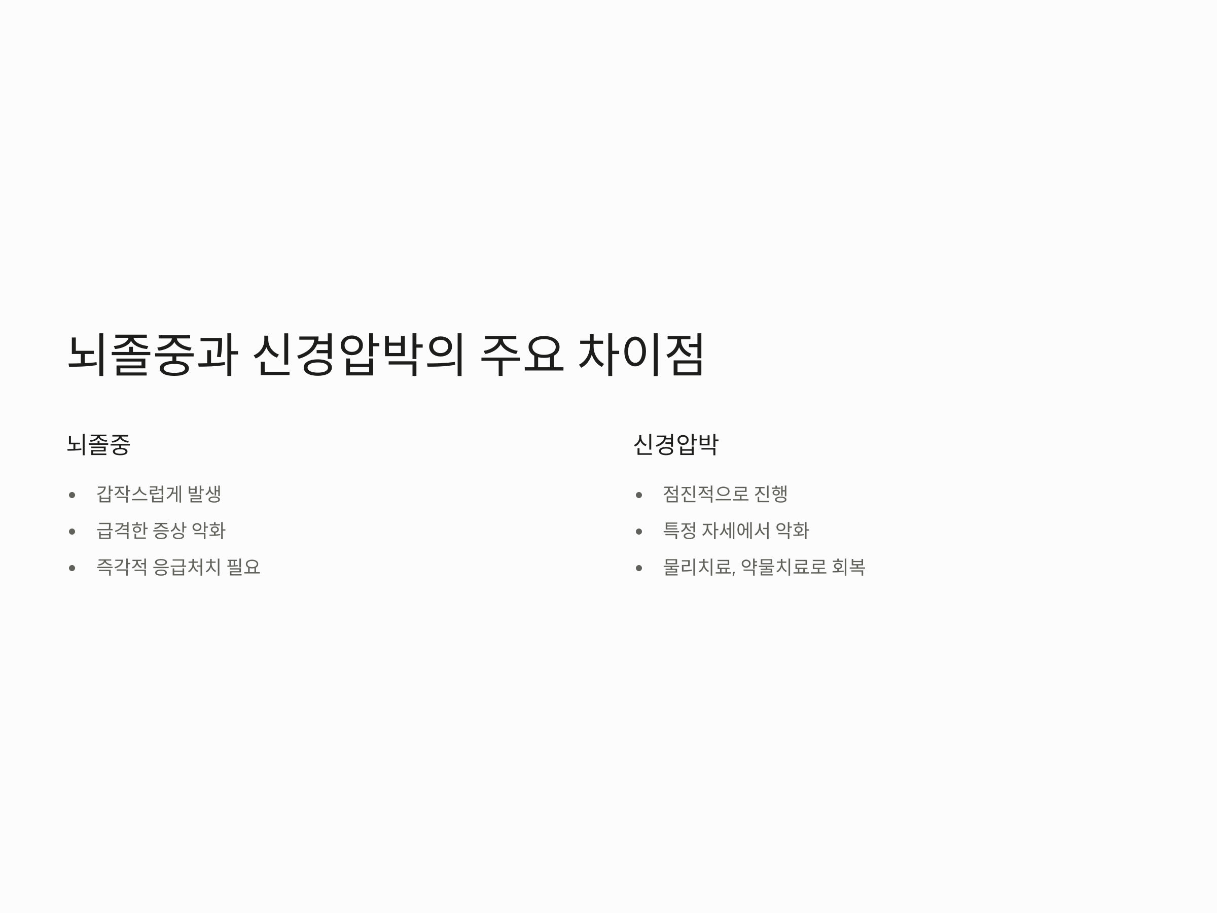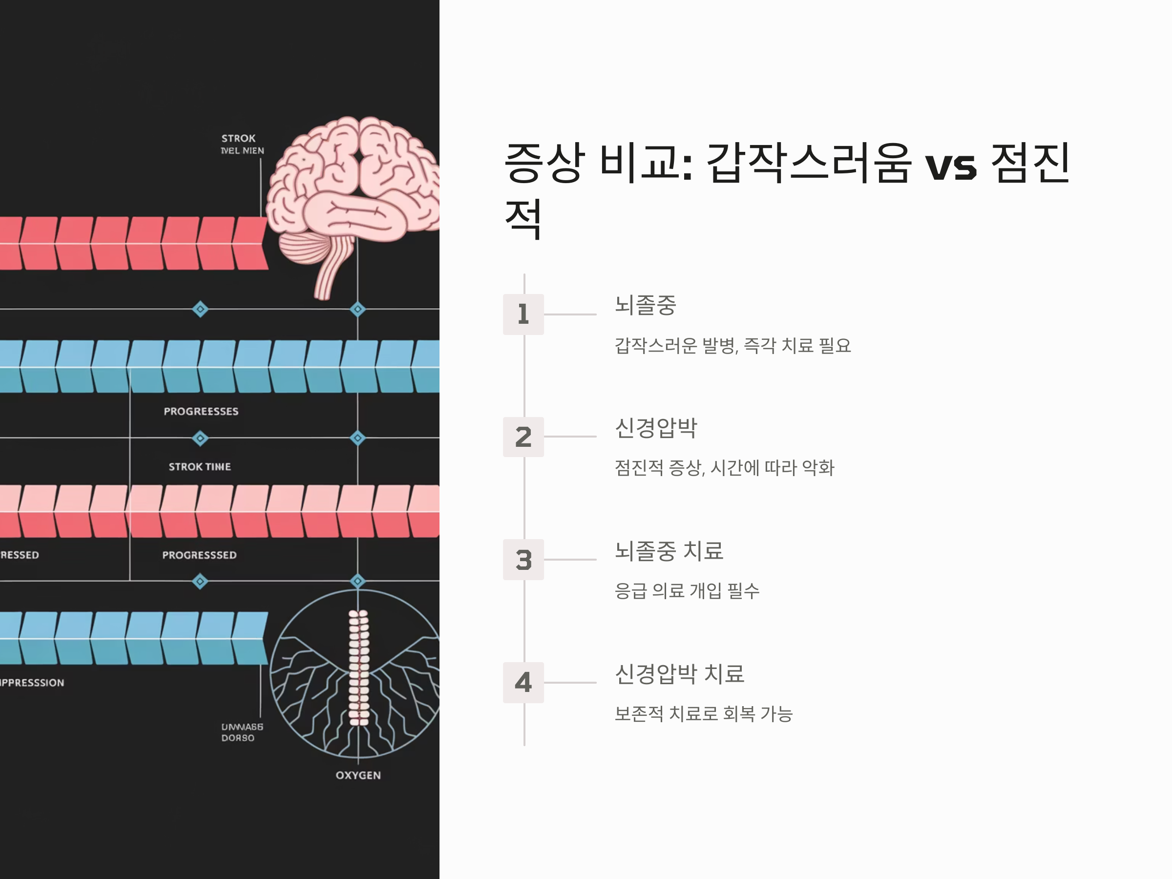 뇌졸중은 갑작스럽고 급격하게 발생하는 질환입니다. 신경압박은 점진적으로 진행되며, 증상이 점차 심해지므로 뇌졸중보다는 서서히 나타나는 경향이 있습니다.