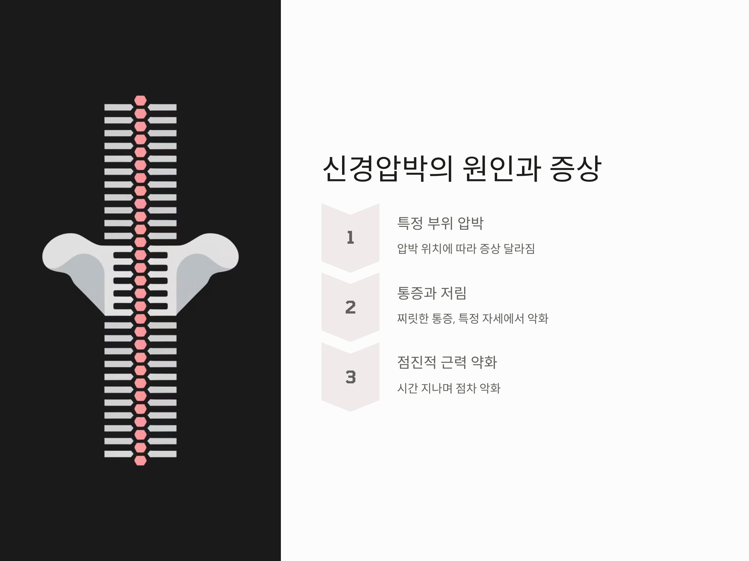 신경압박은 척추나 신경이 압박을 받으면서 발생하는 증상입니다. 척추의 디스크가 탈출하거나, 척추관 협착증 등으로 인해 신경에 압력이 가해지면 신경에 문제가 생기고, 팔과 다리의 힘이 빠지는 증상이 나타날 수 있습니다. 신경압박에 의한 증상은 일반적으로 다음과 같습니다: