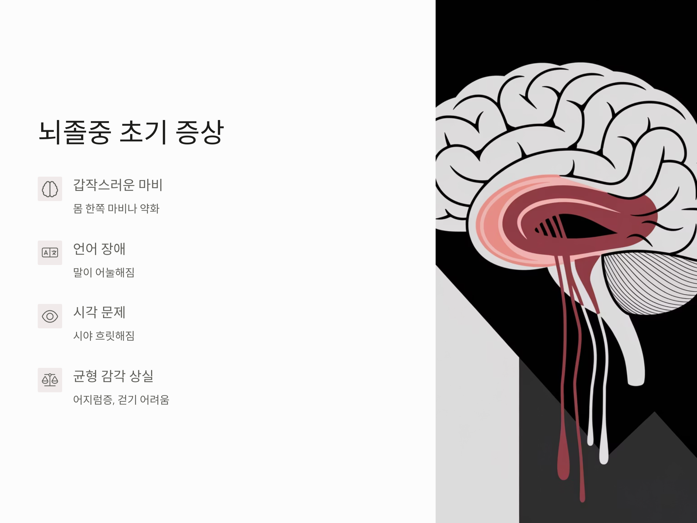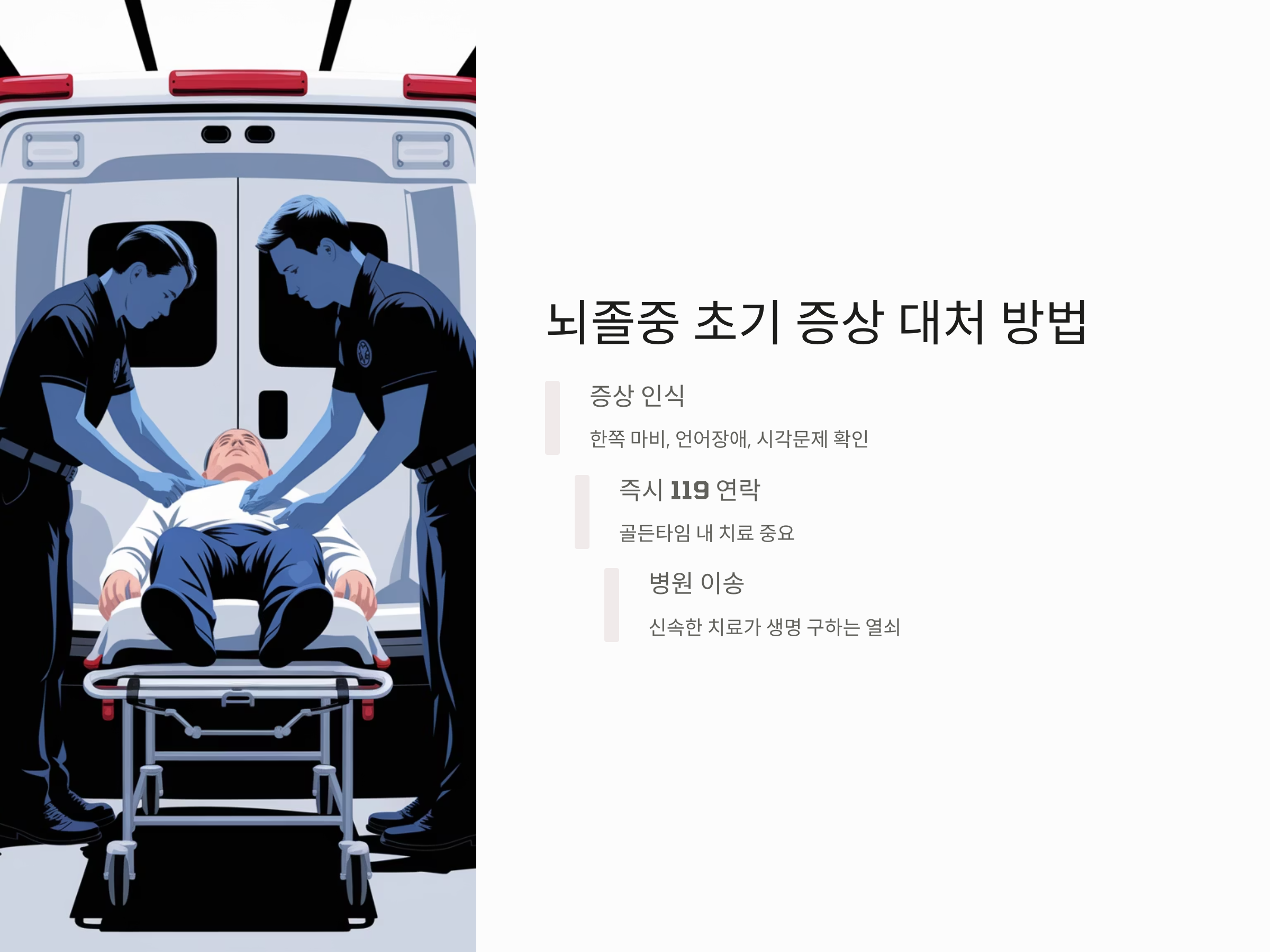 뇌졸중의 초기 증상은 매우 급작스럽고 심각하므로 즉각적인 대응이 필요합니다. 만약 한쪽 팔과 다리에 힘이 빠지거나, 언어 장애, 시각 문제, 어지럼증 등이 발생한다면 즉시 119에 연락하여 병원으로 이송할 필요가 있습니다. 뇌졸중 치료는 시간과 싸우는 문제이기 때문에, 가능한 한 빠르게 치료를 받는 것이 생명을 구하는 중요한 열쇠가 됩니다.
