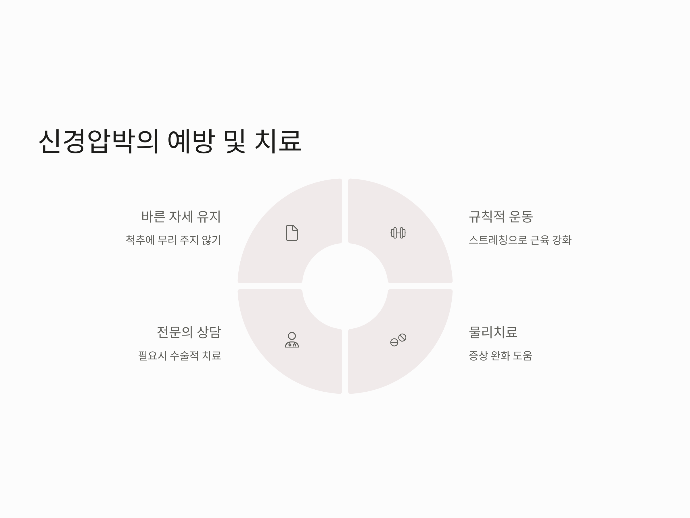 신경압박의 치료는 물리 치료나 약물 치료로 증상을 완화할 수 있습니다. 심한 경우 수술적 치료가 필요할 수도 있으며, 전문의와 상담하여 적절한 치료 방법을 결정하는 것이 중요합니다.