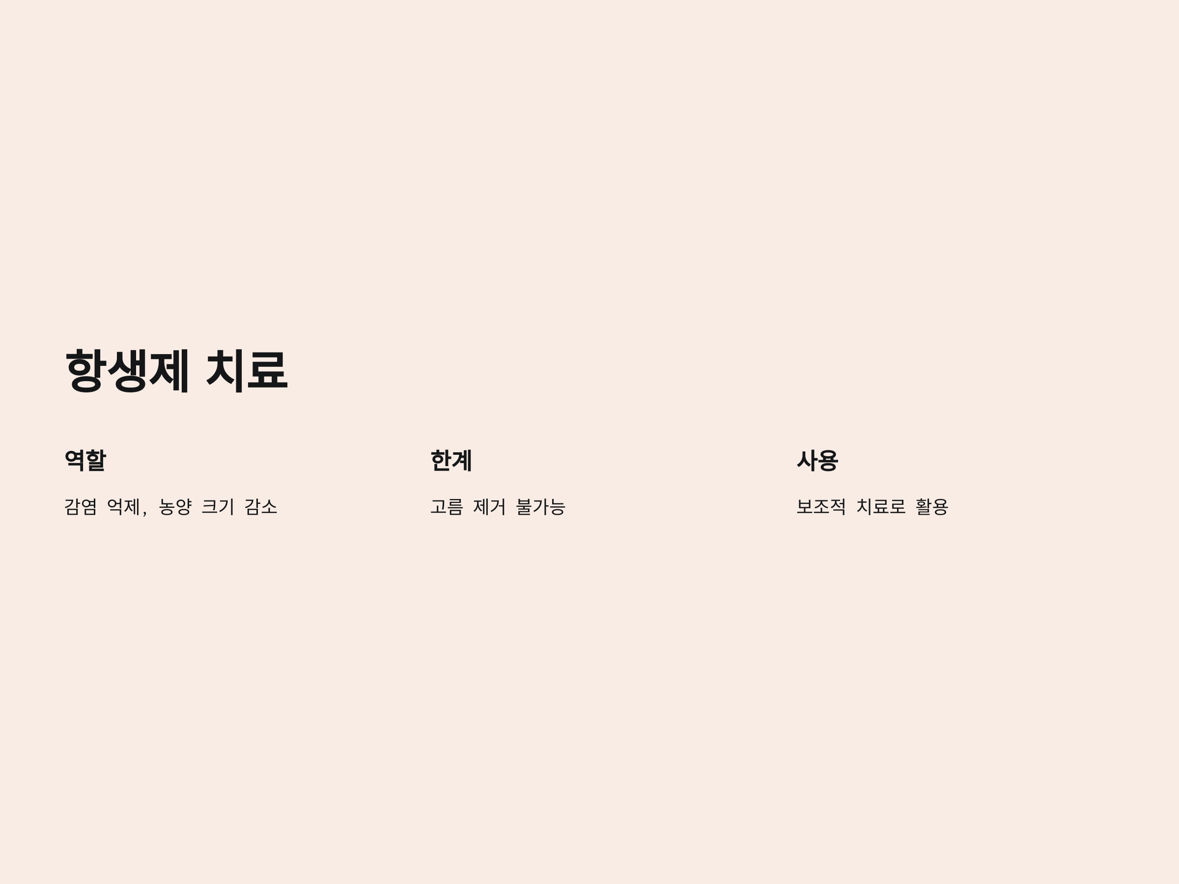 항문 주위 농양의 초기 치료로 항생제 치료가 사용됩니다. 그러나 항생제 치료만으로 농양을 완전히 치료하는 데에는 한계가 있습니다. 항생제는 감염을 억제하고, 농양의 크기를 줄이는데 도움을 주지만, 농양 속의 고름을 제거하지 않으면 완전한 치유는 어려운 경우가 많습니다【9†source】. 따라서 항생제는 보조적인 치료로 사용되며, 농양이 진행되거나 통증이 심해지면 배농술을 시행하는 것이 일반적입니다.