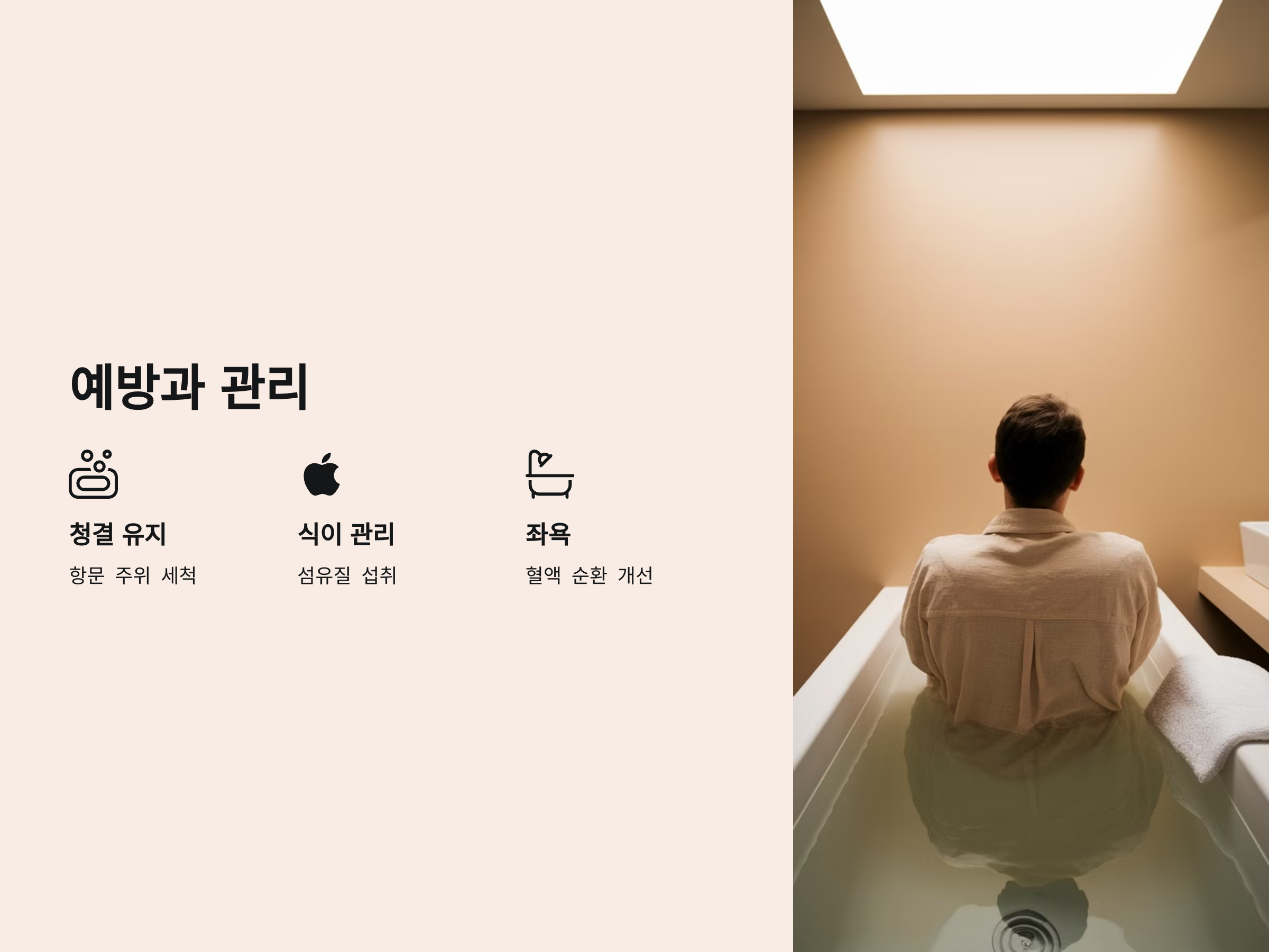 좌욕도 예방에 도움이 됩니다. 따뜻한 물에 앉아 혈액 순환을 돕고, 항문 주위의 염증을 완화하는 데 효과적입니다. 또한, 조기에 증상이 나타나면 즉시 병원을 방문하여 적절한 진단과 치료를 받는 것이 중요합니다【9†source】【10†source】.