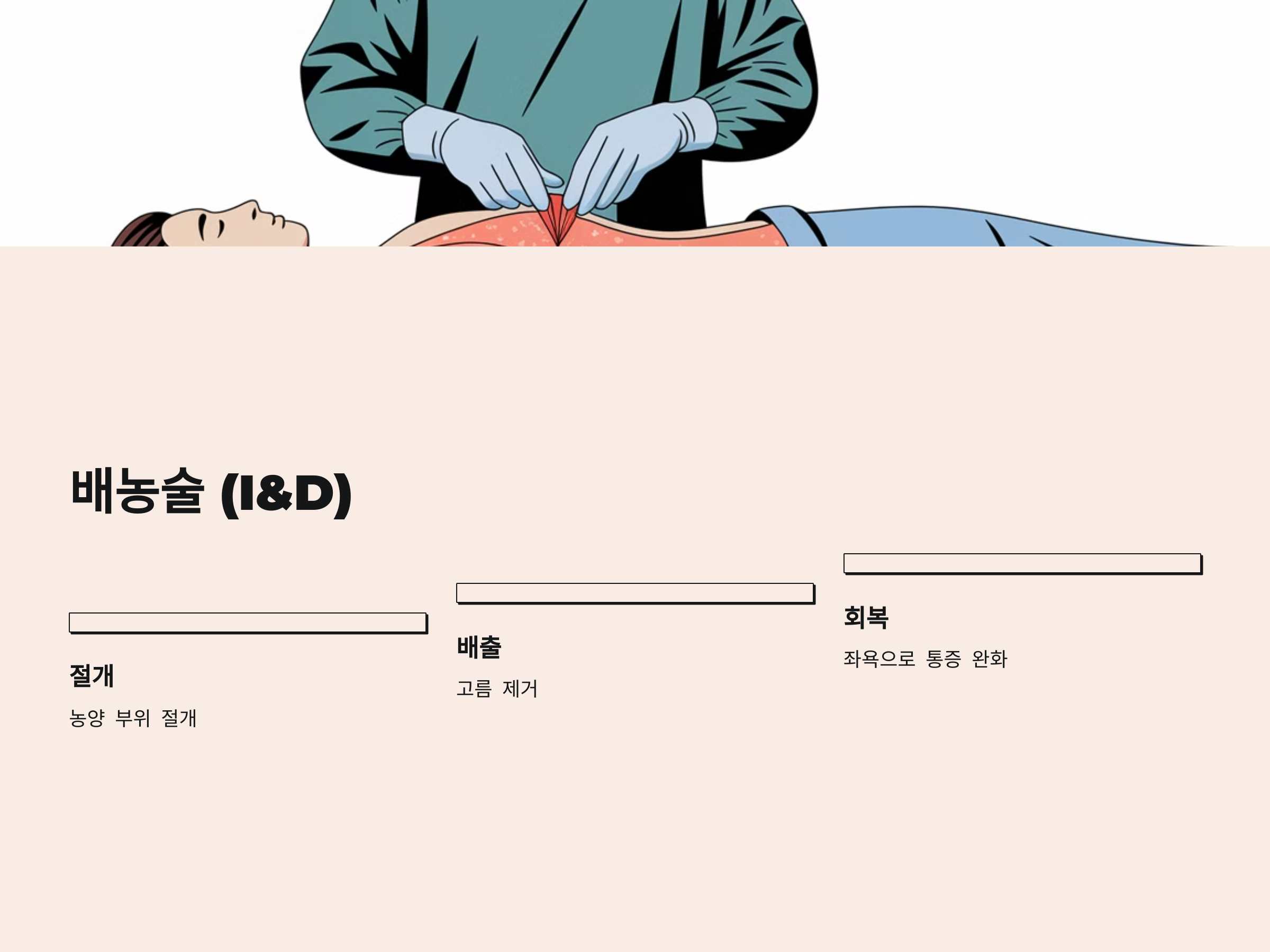 배농술(Incision and Drainage, I&D)은 항문 주위 농양 치료에서 가장 중요한 수술 방법입니다. 배농술은 농양을 절개하여 고름을 배출하는 과정으로, 고름을 제거함으로써 통증을 완화하고 감염이 확산되는 것을 방지합니다【8†source】【9†source】. 이 수술은 국소 마취나 척추 마취를 통해 진행되며, 절개 부위에 고름이 잘 배출될 수 있도록 도와줍니다.