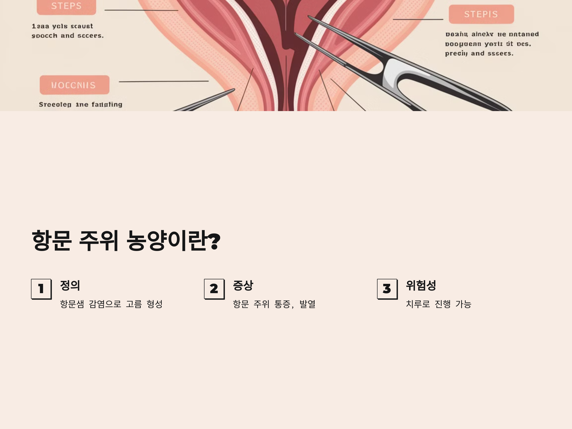 항문 주위 농양은 항문 주위에 고름이 고이는 질환으로, 주로 항문샘에 감염이 발생하여 발생합니다. 이 농양은 통증을 유발하고, 제때 치료하지 않으면 치루로 진행될 수 있어 치료가 매우 중요합니다. 이번 글에서는 항문 주위 농양의 주요 치료법인 항생제 치료 및 배농술, 그리고 이러한 치료에 대한 건강보험 적용 여부에 대해 알아보겠습니다.