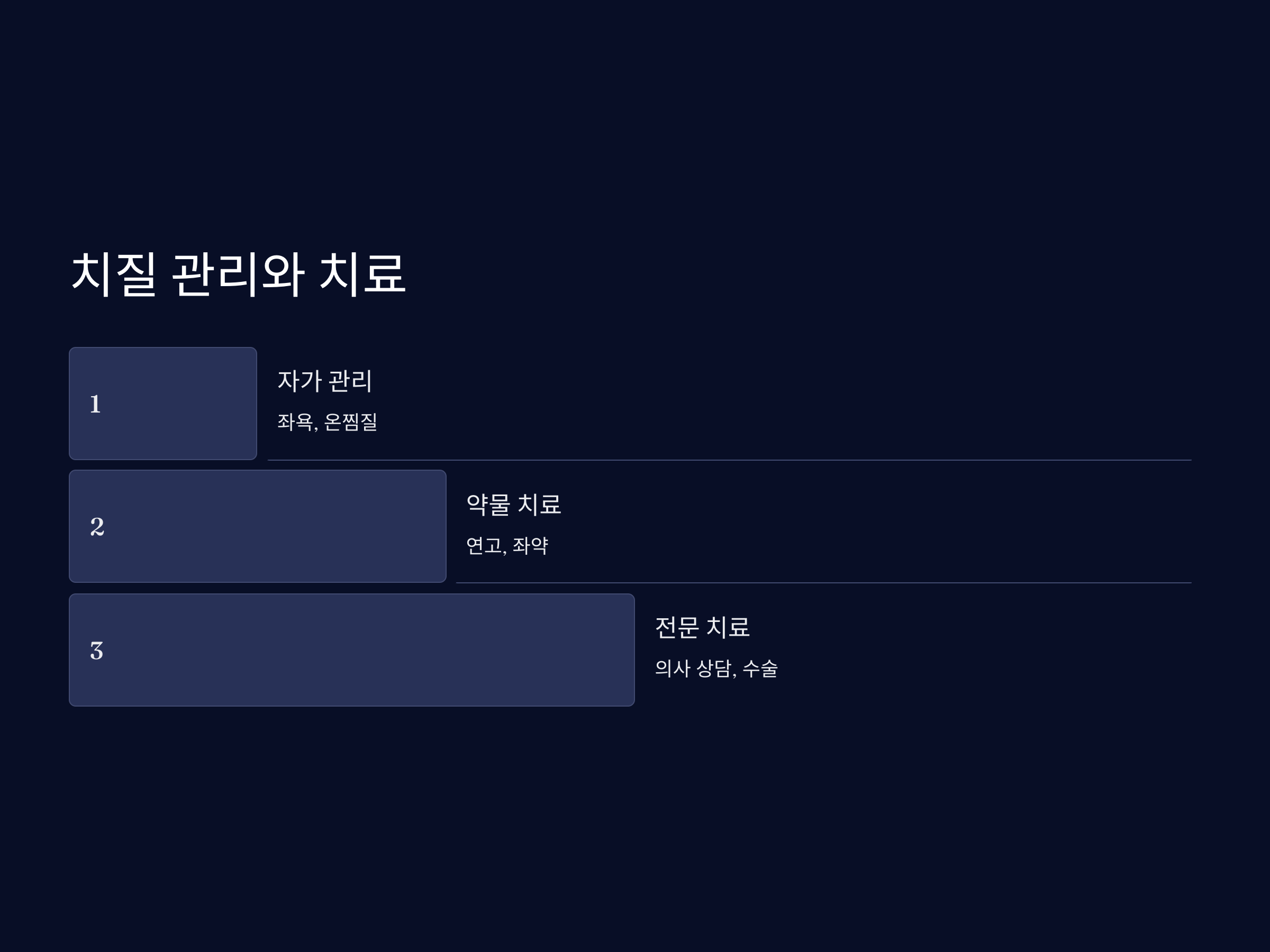 치질이 발생한 경우에는 배변 습관을 개선하고, 식이섬유를 충분히 섭취하는 것이 중요합니다. 또한, 치질에 의한 출혈이 지속될 경우에는 전문의의 진료를 받는 것이 필요합니다. 치료 방법에는 약물 치료, 좌욕, 또는 심한 경우 수술적 치료가 필요할 수 있습니다.