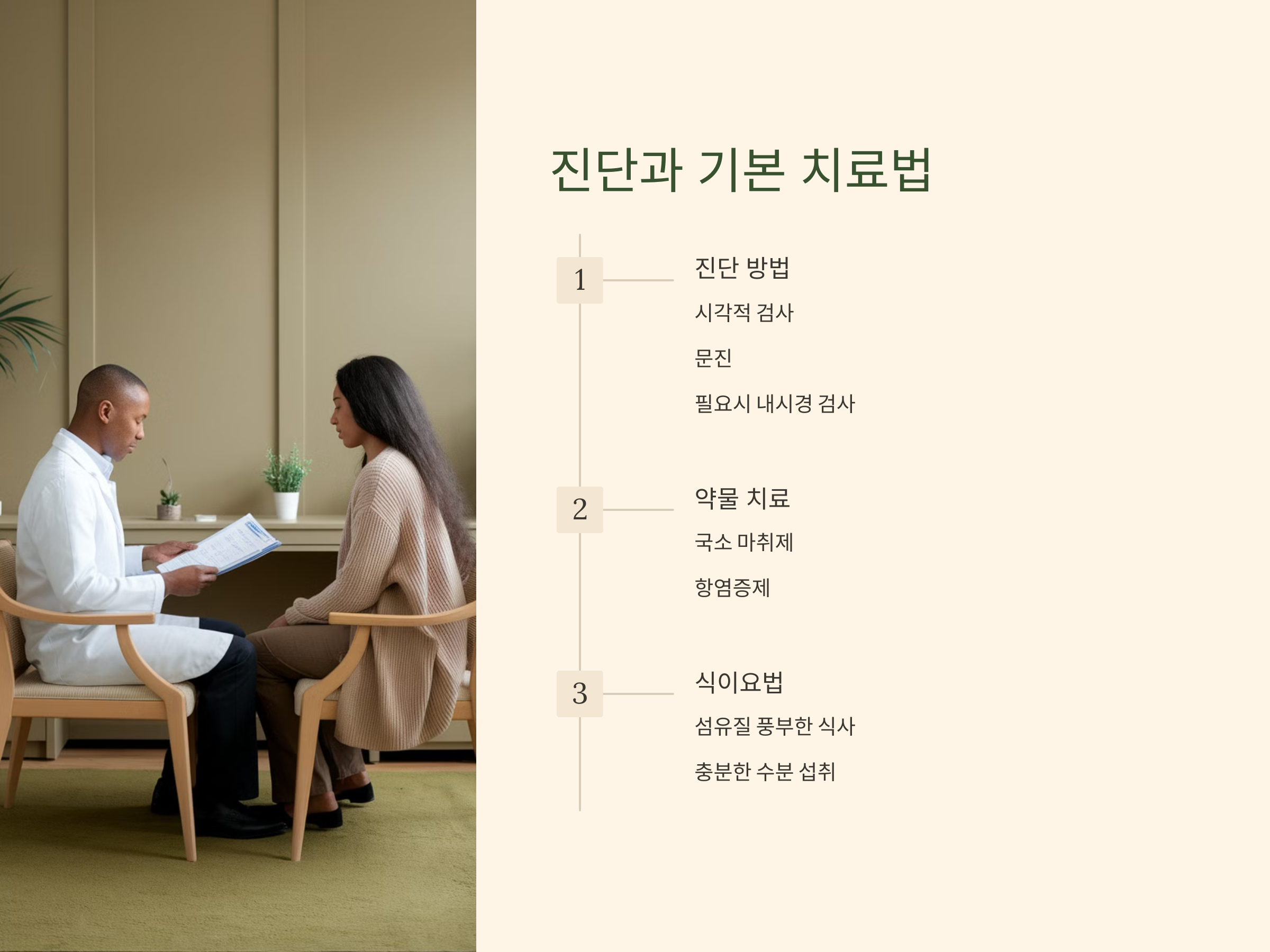 항문 치열의 치료는 기본적으로 약물 치료와 식이요법을 통해 시작됩니다. 대표적인 약물로는 항문에 바르는 국소 마취제나 항염증제가 사용됩니다. 이 약물들은 염증을 줄여주고, 통증을 완화시키는 데 도움을 줍니다. 또한, 섬유질이 풍부한 식사와 충분한 수분 섭취를 통해 변비를 예방하는 것이 중요합니다.