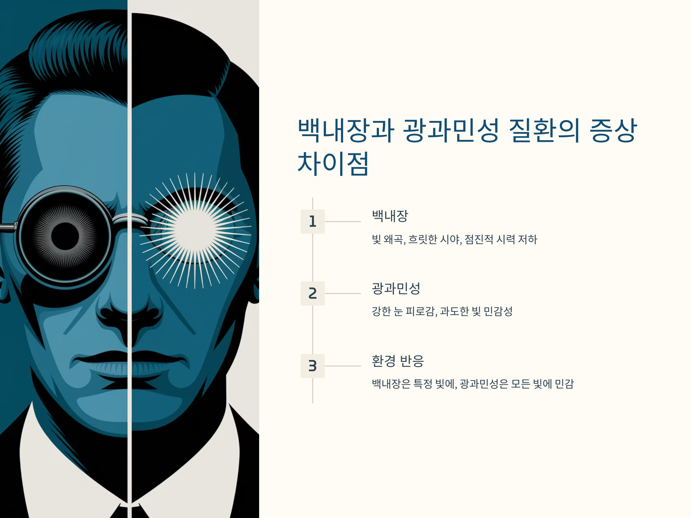 백내장과 광과민성 질환은 모두 햇빛에 대한 민감도를 높일 수 있지만, 그 차이점은 명확합니다. 백내장 초기에는 햇빛을 보면 눈이 부시거나 흐릿하게 보이는 증상이 나타날 수 있으며, 이는 수정체의 혼탁으로 인해 빛이 왜곡되기 때문입니다. 그러나 광과민성 질환은 눈의 피로와 불편함을 더욱 강하게 유발하며, 일반적인 빛의 강도에 대해 지나치게 민감하게 반응합니다.