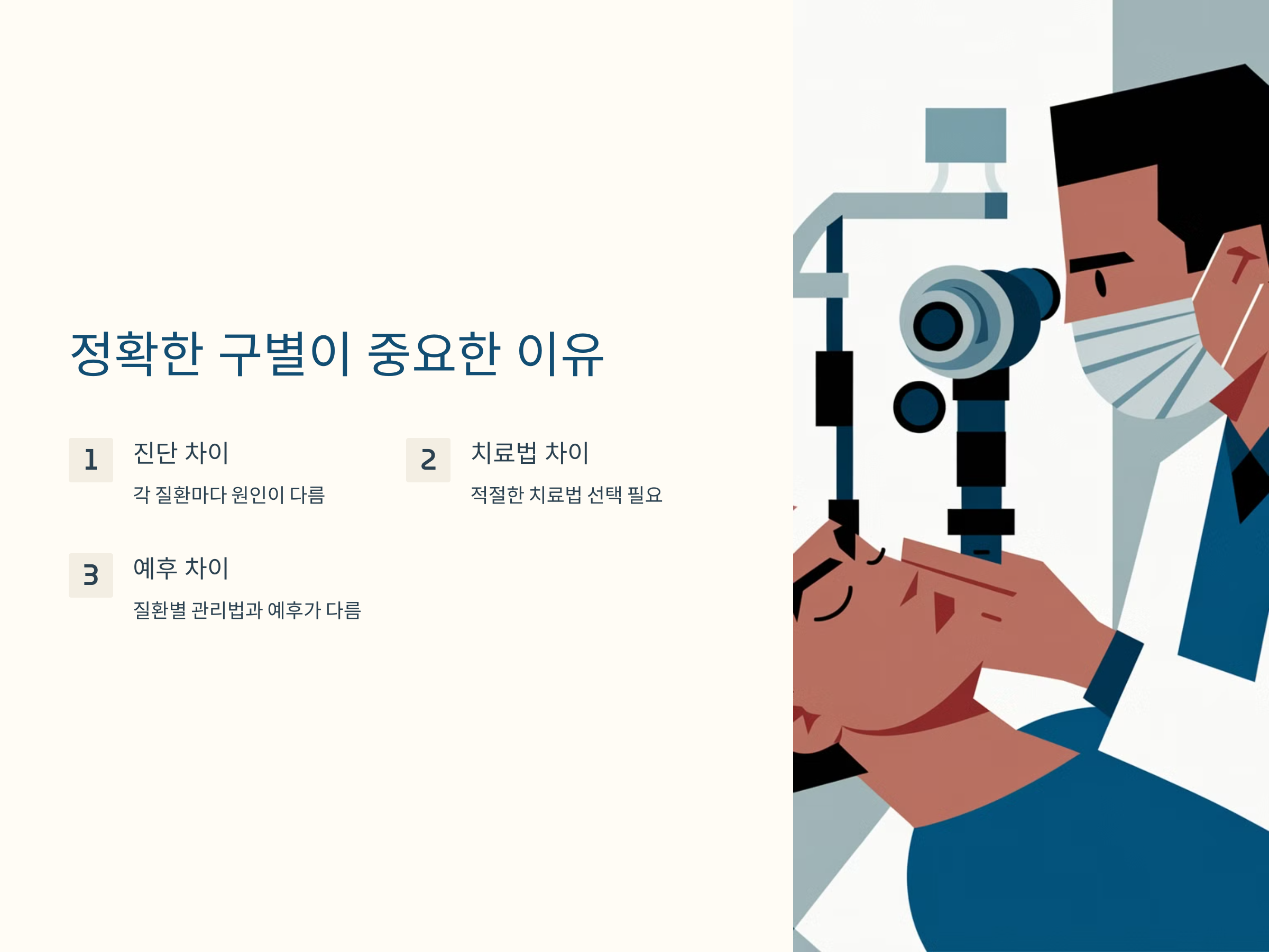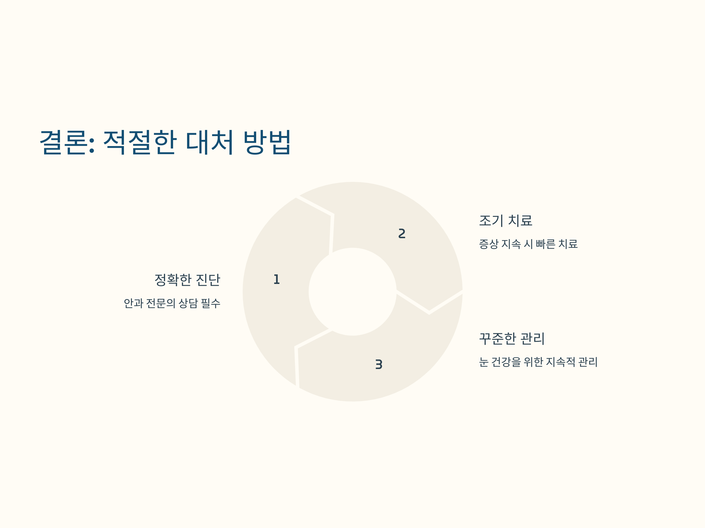 따라서, 증상이 지속되거나 불편함이 심해지는 경우, 빠르게 안과 전문의를 찾아 진단을 받고 적절한 치료를 시작하는 것이 중요합니다. 눈 건강을 지키는 것이 결국 일상적인 삶의 질을 높이는 데 큰 도움이 됩니다.
