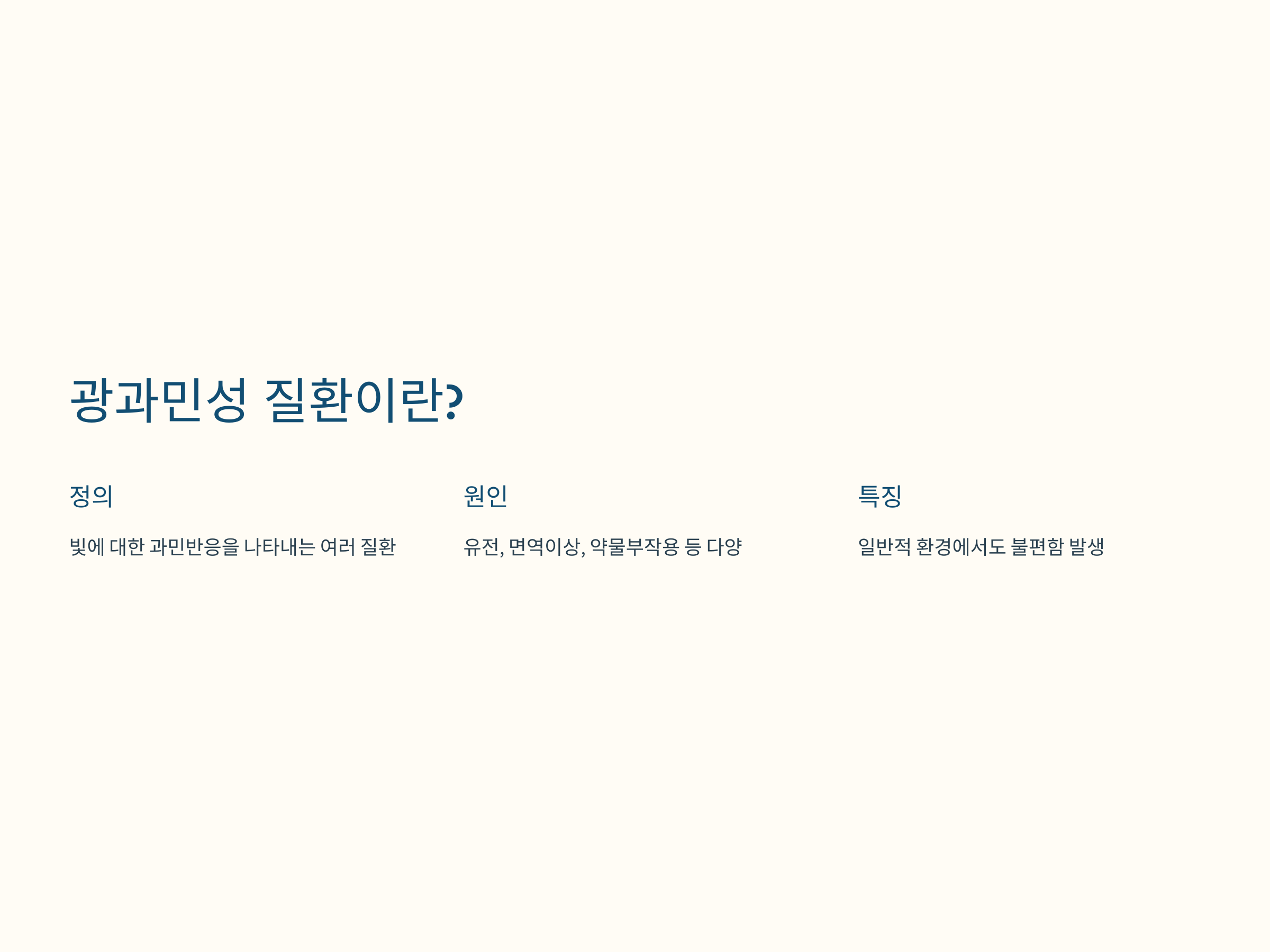 광과민성 질환은 빛에 대한 과민반응을 나타내는 여러 질환을 말합니다. 햇빛을 포함한 다양한 빛에 노출되었을 때 눈이 불편하거나 아픈 증상이 발생하는 것이 특징입니다. 이러한 증상은 단순한 빛의 강도만이 아니라, 눈의 건강 상태와도 밀접한 관계가 있습니다. 광과민성 질환을 가진 사람들은 빛에 과도하게 민감하여 일반적인 환경에서도 불편함을 느낄 수 있습니다.
