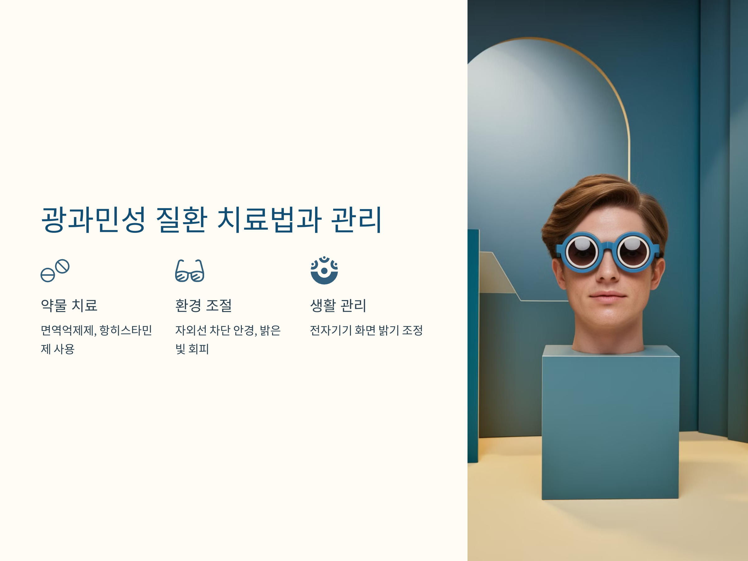 광과민성 질환은 원인에 따라 치료법이 달라집니다. 우선, 원인 질환을 찾고 이를 치료하는 것이 가장 중요한 단계입니다. 면역 체계에 이상이 있을 경우, 면역억제제나 항히스타민제를 사용할 수 있으며, 약물에 의한 경우에는 약물의 변경이 필요할 수 있습니다.