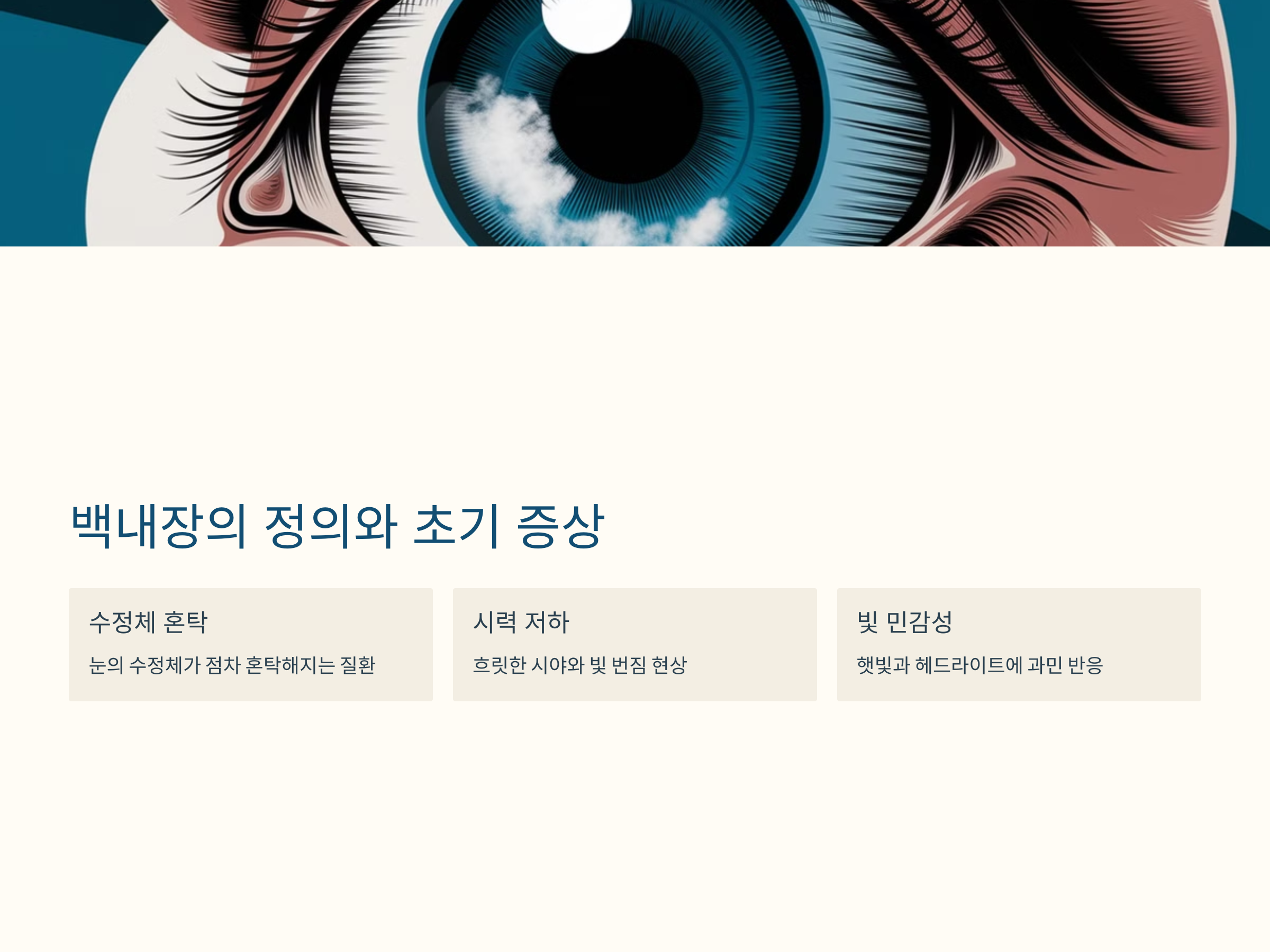 백내장은 눈의 수정체가 혼탁해져 시력이 점차적으로 흐려지는 질환입니다. 일반적으로 나이가 들면서 발생하는 질환이지만, 외상이나 질병 등 여러 가지 원인에 의해서도 발생할 수 있습니다. 백내장의 초기 증상은 가벼운 시력 저하에서부터 시작되며, 햇빛에 민감해지는 증상도 동반될 수 있습니다. 초기에는 흐릿한 시야와 빛이 퍼져 보이는 느낌이 나타날 수 있으며, 이는 햇빛에 특히 민감한 사람들이 쉽게 느낄 수 있는 증상입니다.
