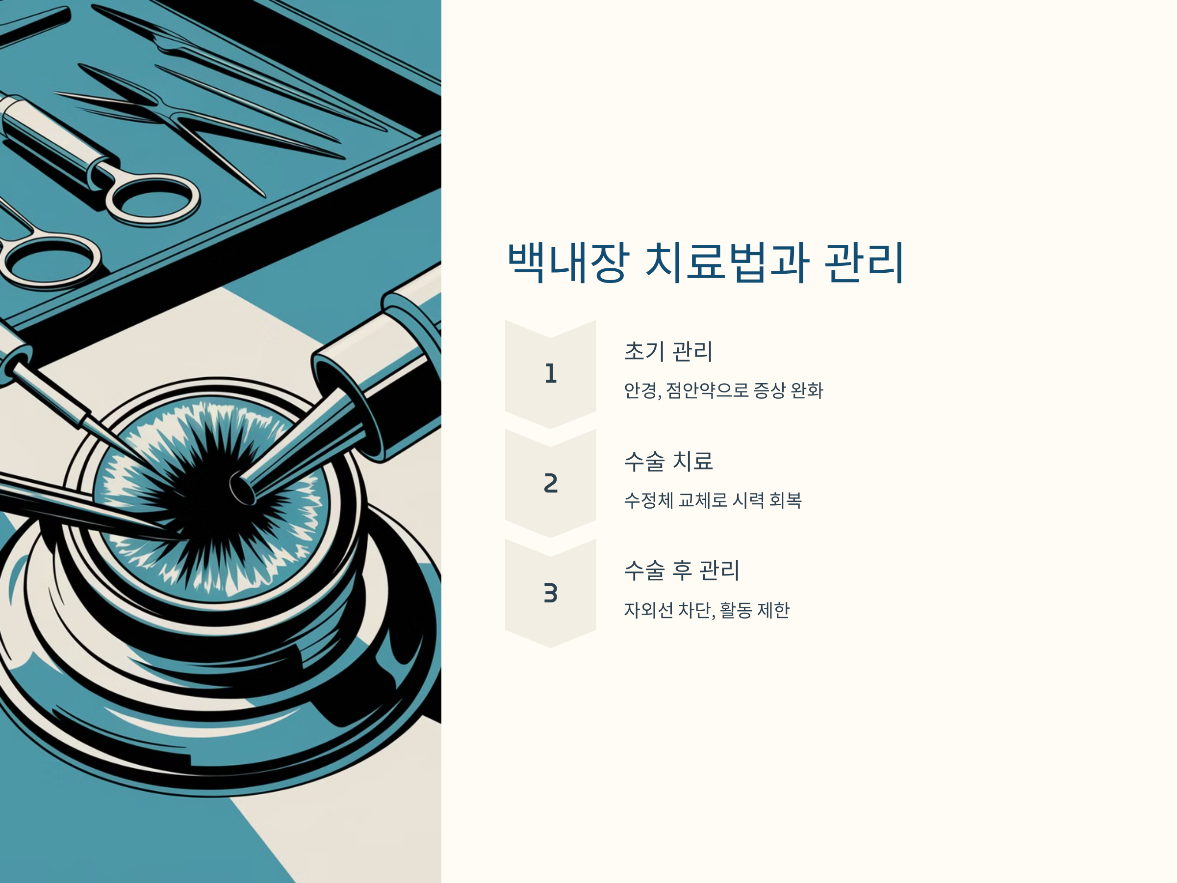 백내장의 치료는 초기에는 보통 비수술적인 방법으로 진행됩니다. 초기 단계에서 안경을 착용하거나 점안약을 사용하여 증상을 완화할 수 있습니다. 그러나 백내장이 진행되면 시력 저하가 심해지기 때문에 수술적 치료가 필요할 수 있습니다. 백내장 수술은 대부분 안전하며, 수정체를 교체하여 시력을 회복하는 방식입니다.
