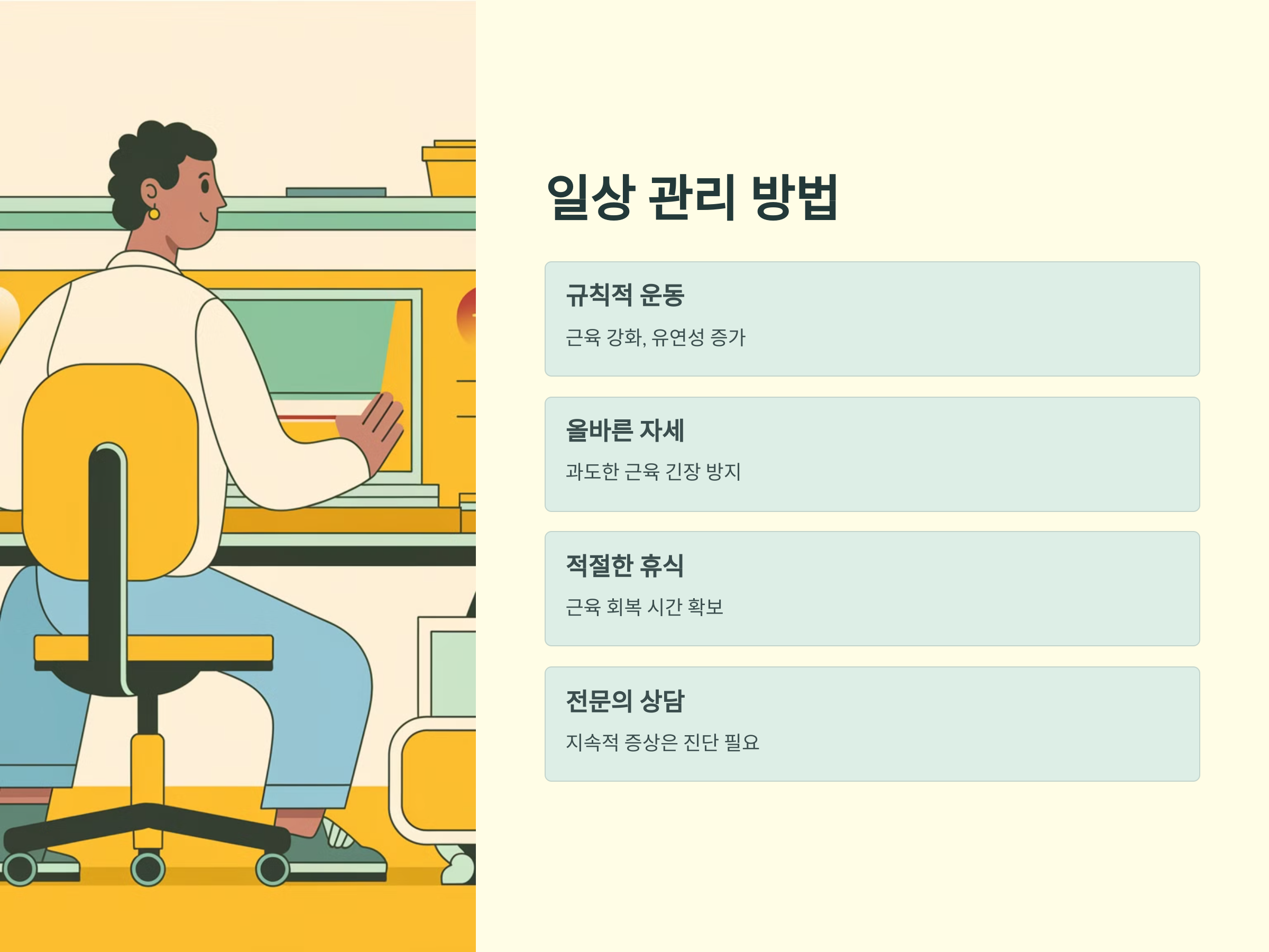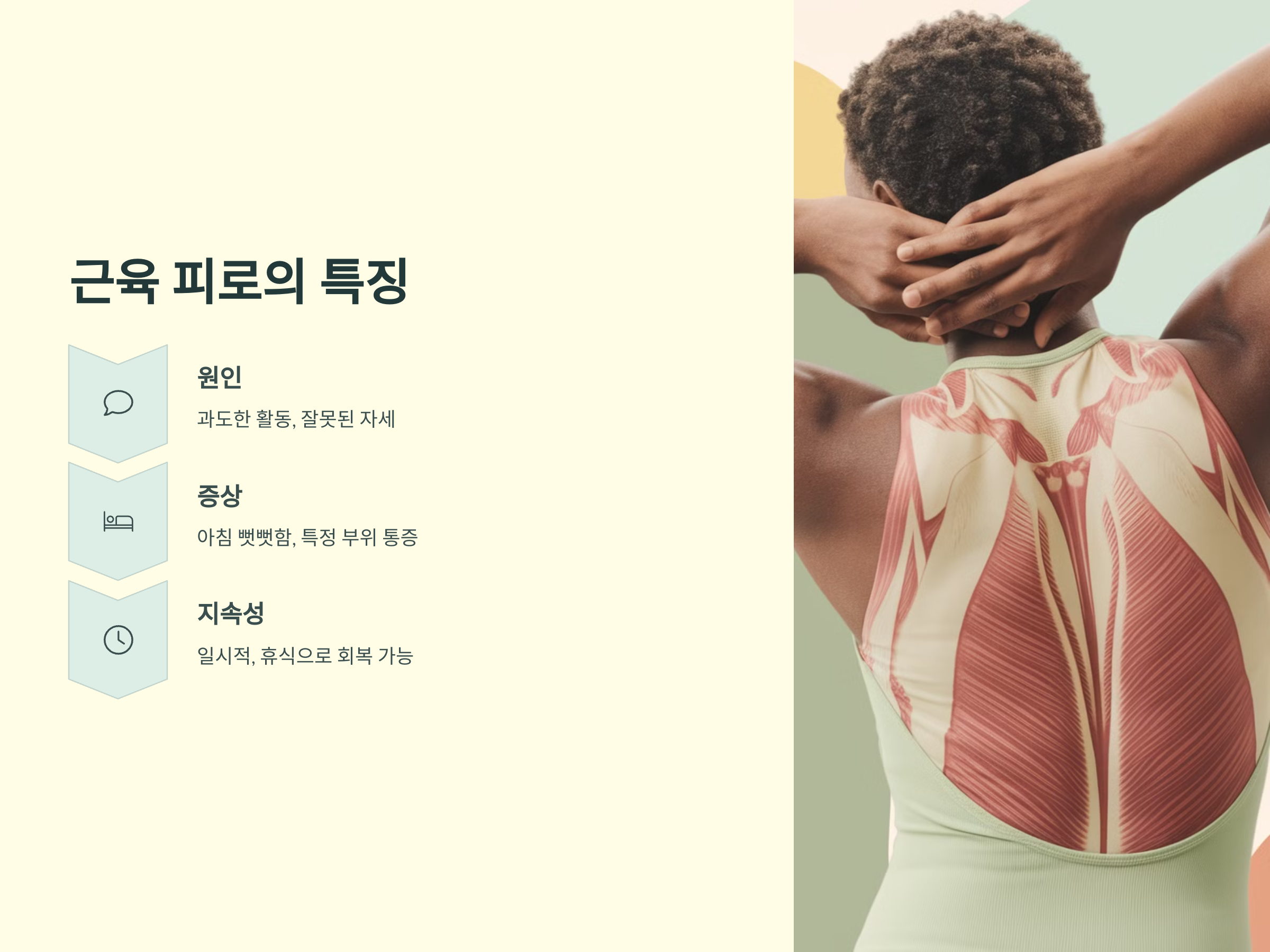 따라서, 만약 증상이 지속되거나 통증이 심해지면 전문의를 찾아 정확한 진단을 받는 것이 필요합니다. 또한, 규칙적인 운동과 올바른 자세를 유지하는 것이 근육 피로를 예방하는 데 큰 도움이 됩니다.