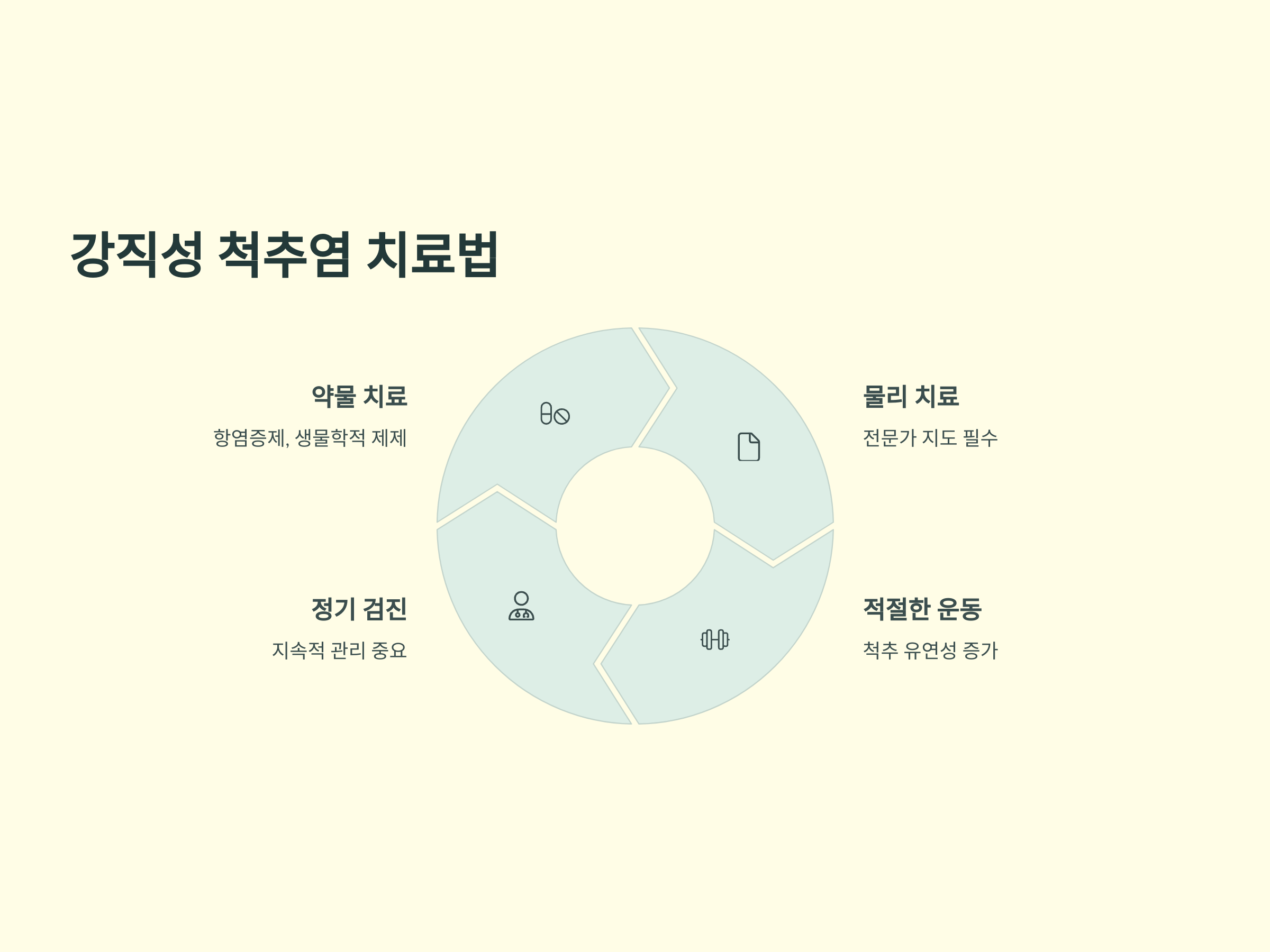 강직성 척추염은 치료가 어려운 만성 질환이지만, 적절한 치료와 관리로 증상을 완화할 수 있습니다. 치료에는 항염증제, 생리적 스트레칭, 물리치료, 그리고 심각한 경우에는 생물학적 제제를 사용한 약물 치료가 포함됩니다. 또한, 적절한 운동과 스트레칭은 척추를 유연하게 만들어주며, 통증을 완화하는 데 중요한 역할을 합니다.