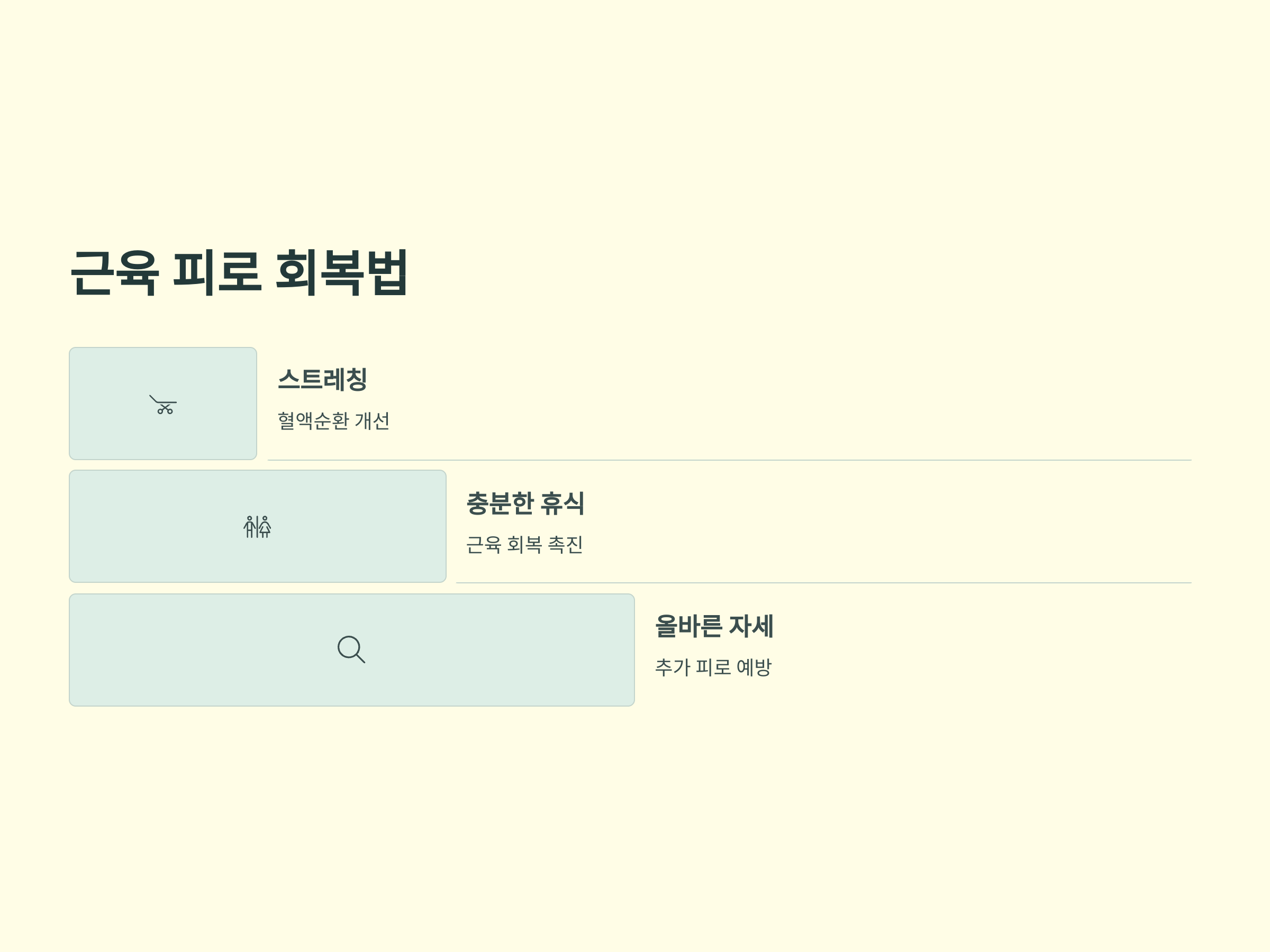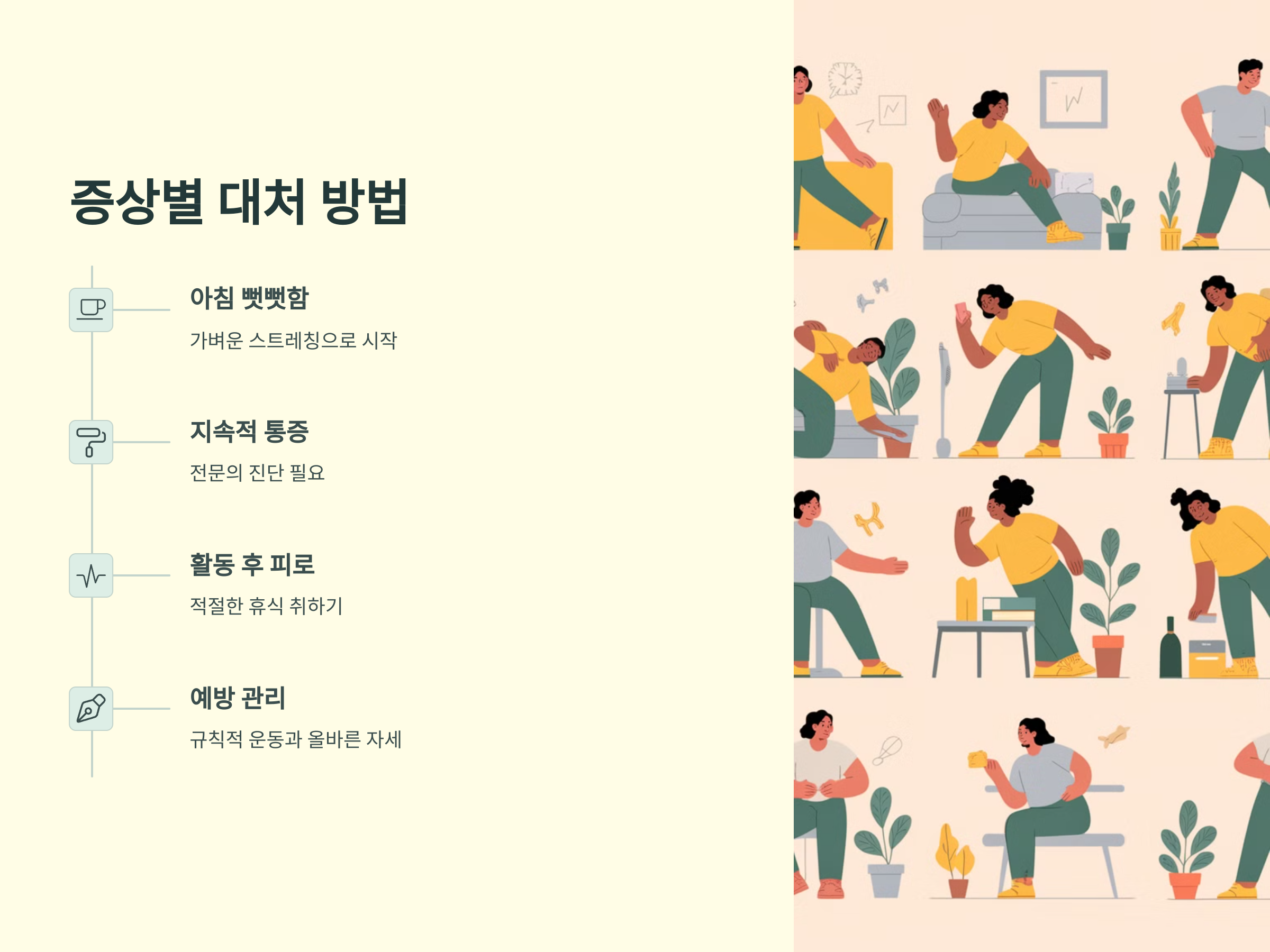 근육 피로는 충분한 휴식과 스트레칭을 통해 쉽게 회복할 수 있습니다. 특히 아침에 일어날 때 허리가 뻣뻣한 경우, 가벼운 스트레칭을 통해 근육을 풀어주는 것이 중요합니다. 스트레칭은 혈액 순환을 개선하고, 근육을 이완시켜 뻣뻣함을 완화시킵니다.