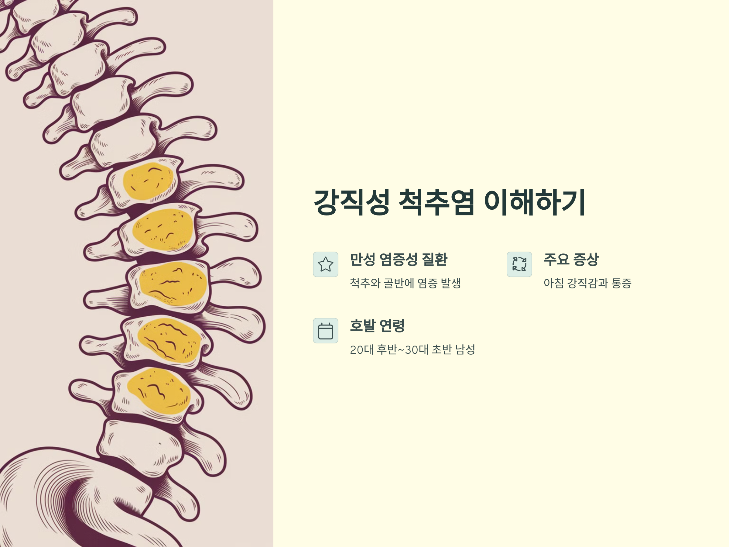 강직성 척추염은 주로 척추와 골반 부위에 염증이 생겨서 통증과 뻣뻣함을 유발하는 만성 질환입니다. 이 질환은 주로 20대 후반에서 30대 초반의 남성에게 많이 나타나며, 염증이 시간이 지나면서 점차적으로 척추의 융합을 초래할 수 있습니다. 강직성 척추염의 주요 증상은 아침에 일어날 때 느껴지는 척추의 강직감과 통증입니다. 이로 인해 일상적인 활동에 어려움을 겪을 수 있으며, 장기간 방치될 경우 척추가 굳어버릴 위험도 존재합니다.