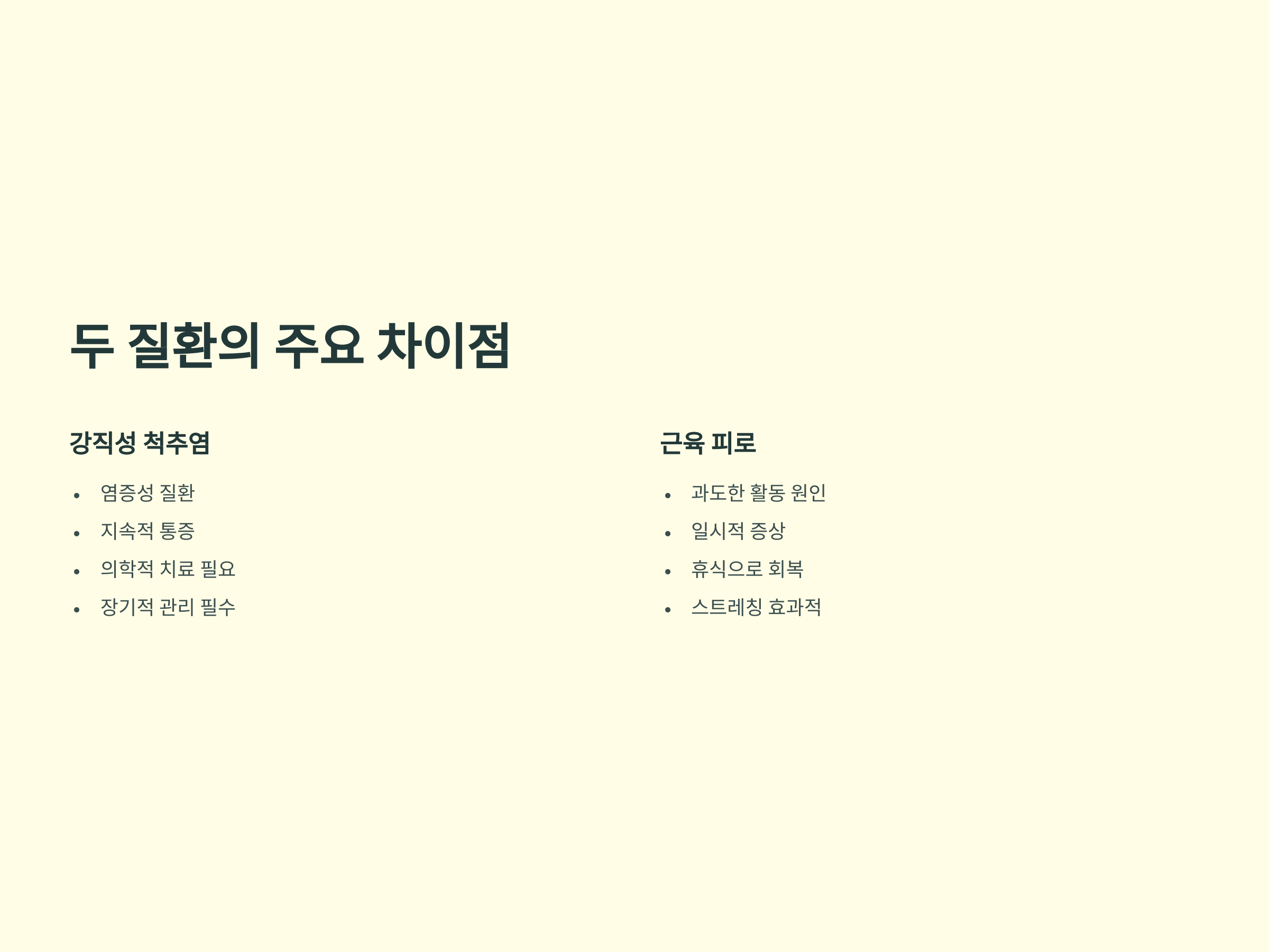 두 가지 증상이 비슷하게 느껴질 수 있지만, 강직성 척추염은 염증과 관련된 질환이므로 의사의 진단을 받는 것이 중요합니다. 반면, 근육 피로는 일반적으로 일상적인 스트레칭과 운동으로 회복이 가능합니다.