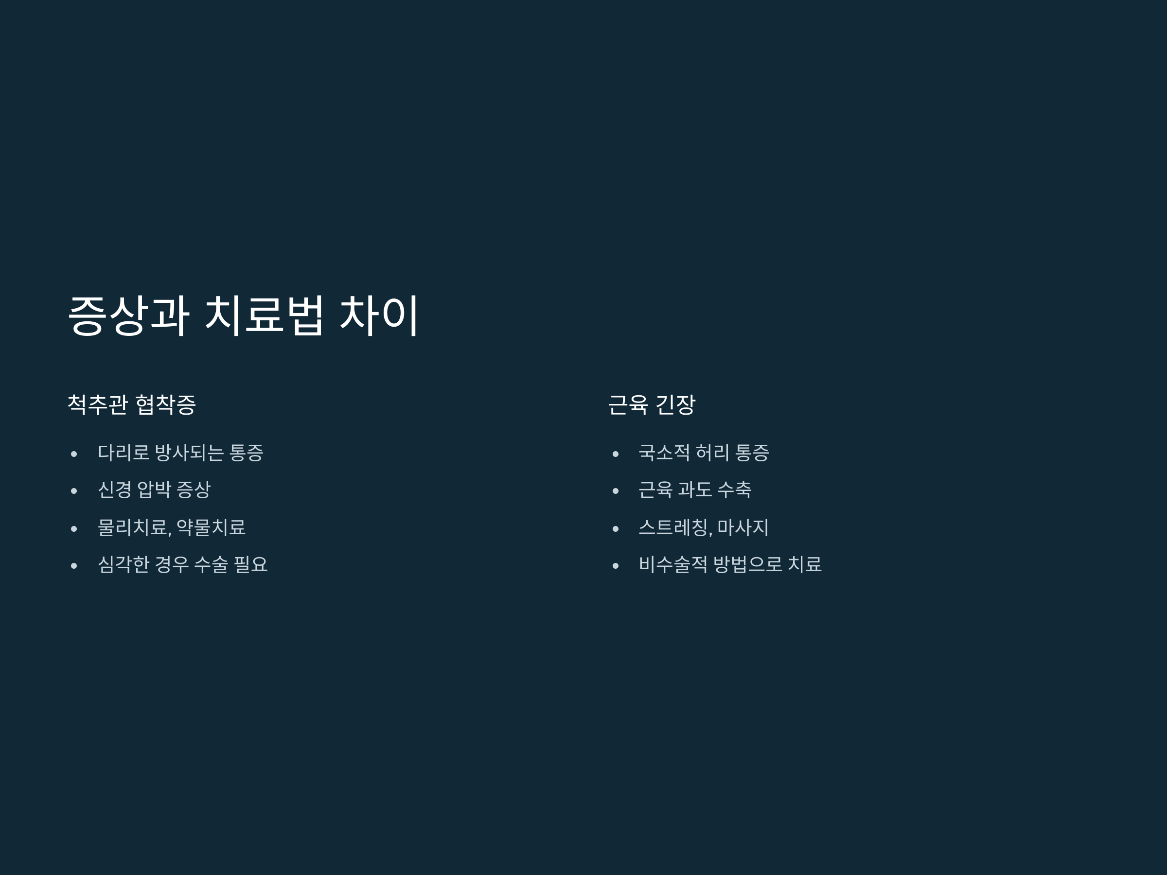 치료 방법에도 차이가 있습니다. 척추관 협착증은 물리치료나 약물치료 외에도, 수술이 필요할 수 있습니다. 하지만 근육 긴장은 대부분 스트레칭, 마사지, 물리치료와 같은 비수술적 방법으로 치료가 가능합니다.