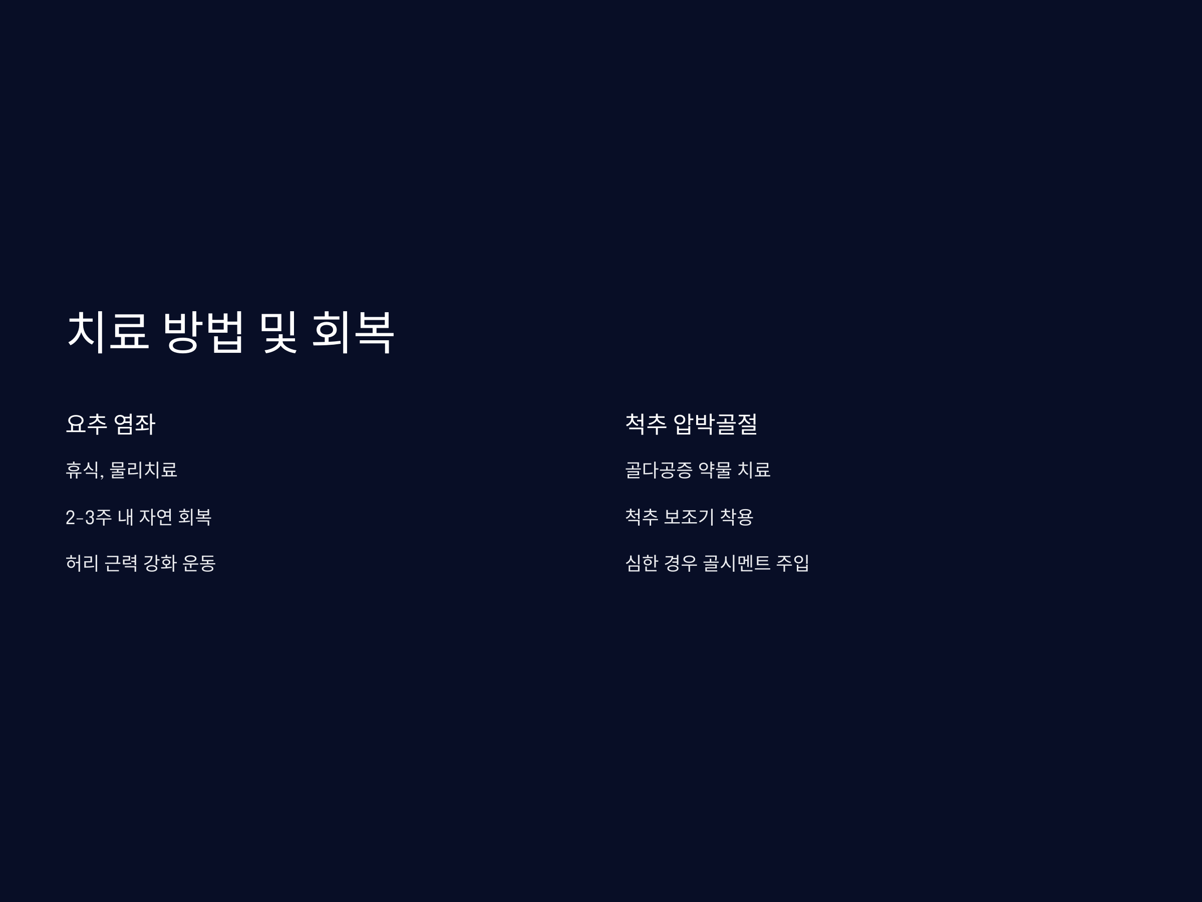 - 보존적 치료: 척추 보조기 착용, 통증 조절