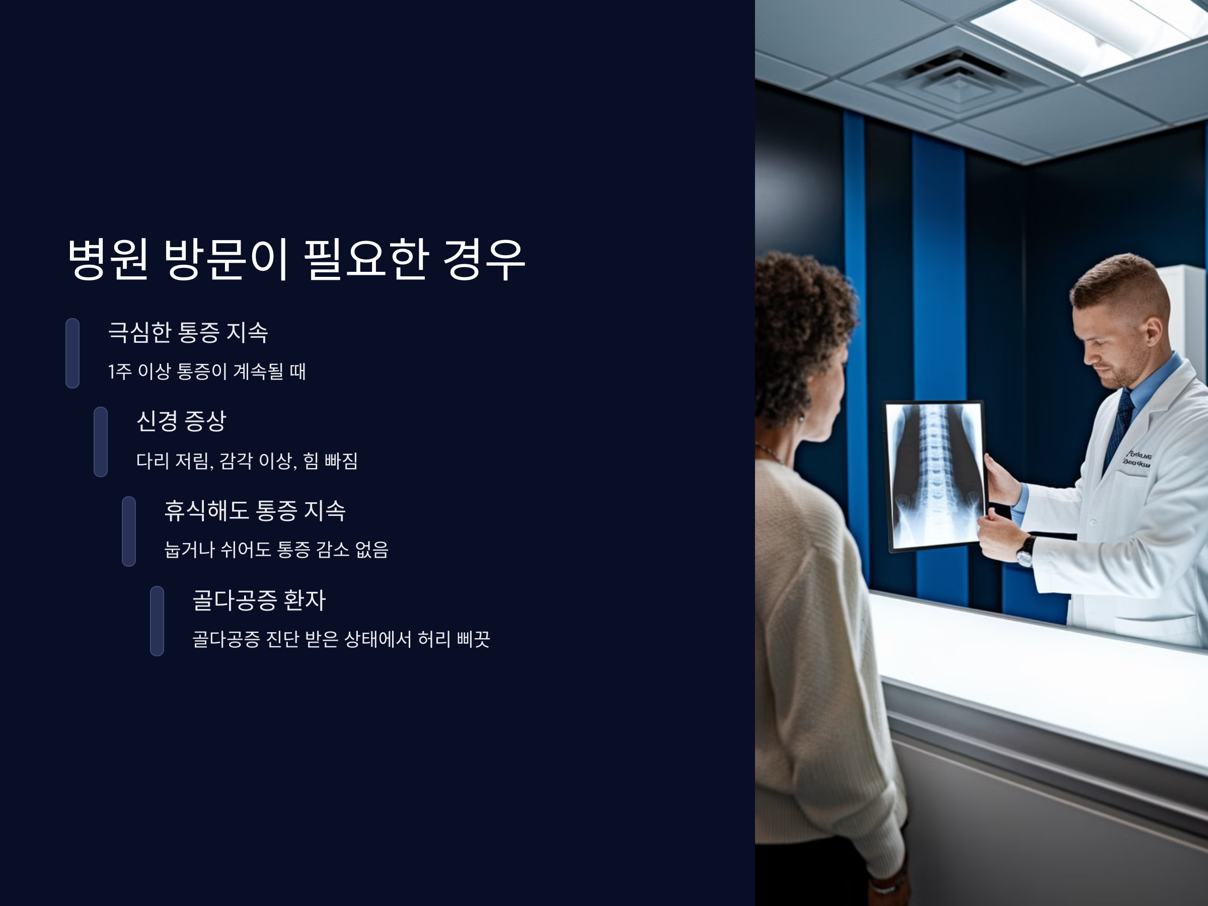 - 병원 방문 – 극심한 통증이 지속되거나 다리 저림이 있을 경우 즉시 진료 필요