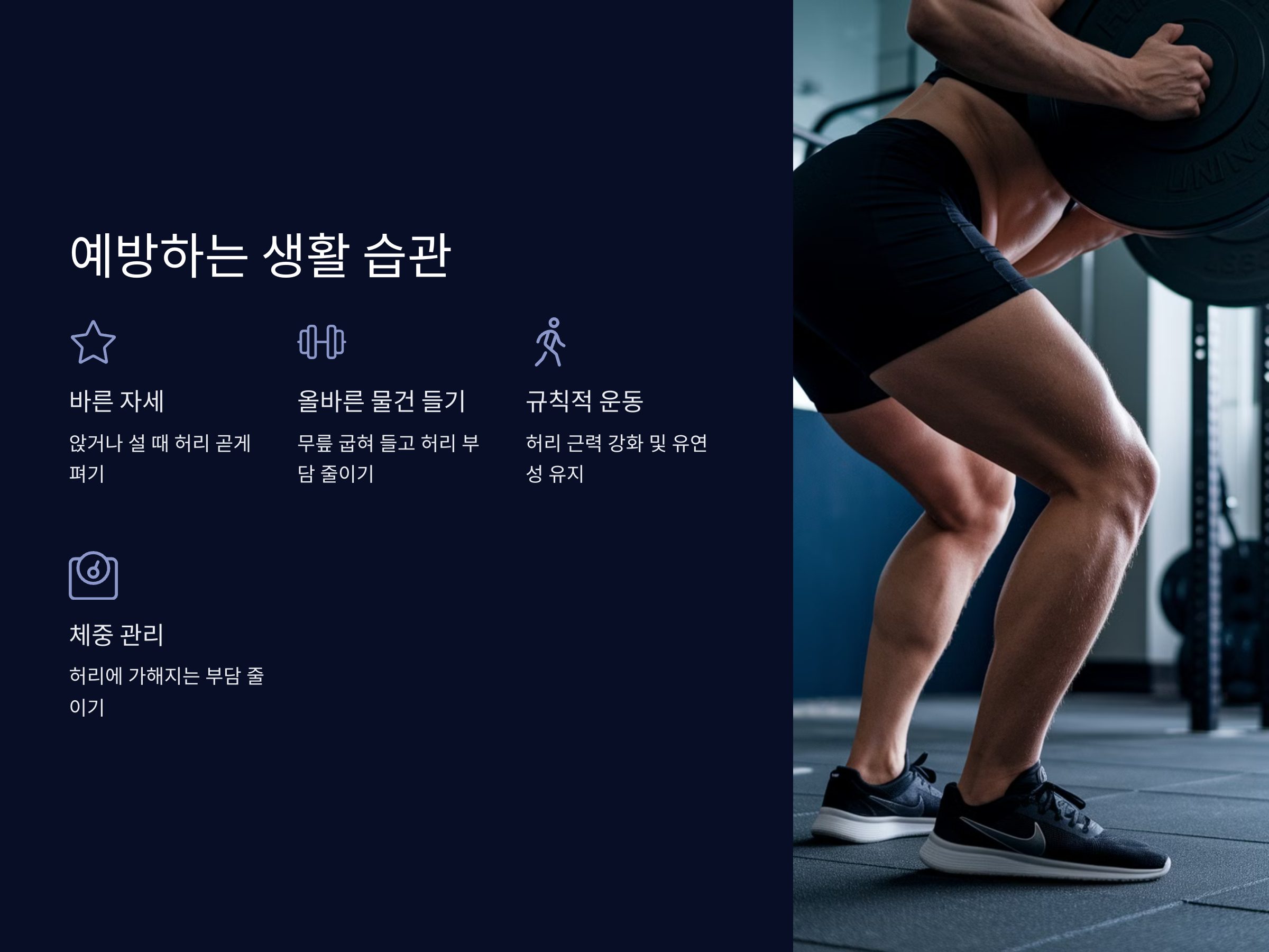 - 규칙적인 운동 – 허리 근력 강화 및 유연성 유지