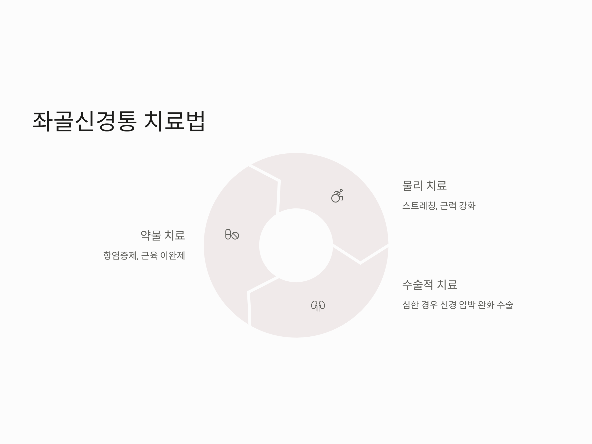 좌골신경통의 치료는 통증 완화가 주된 목표입니다. 우선적으로 약물 치료가 필요할 수 있으며, 통증을 완화하기 위한 비스테로이드성 항염증제(NSAIDs)나 근육 이완제가 사용됩니다. 또한, 물리 치료나 운동 치료를 통해 신경을 압박하는 원인을 개선하고, 스트레칭과 근력 강화를 통해 증상을 관리할 수 있습니다.