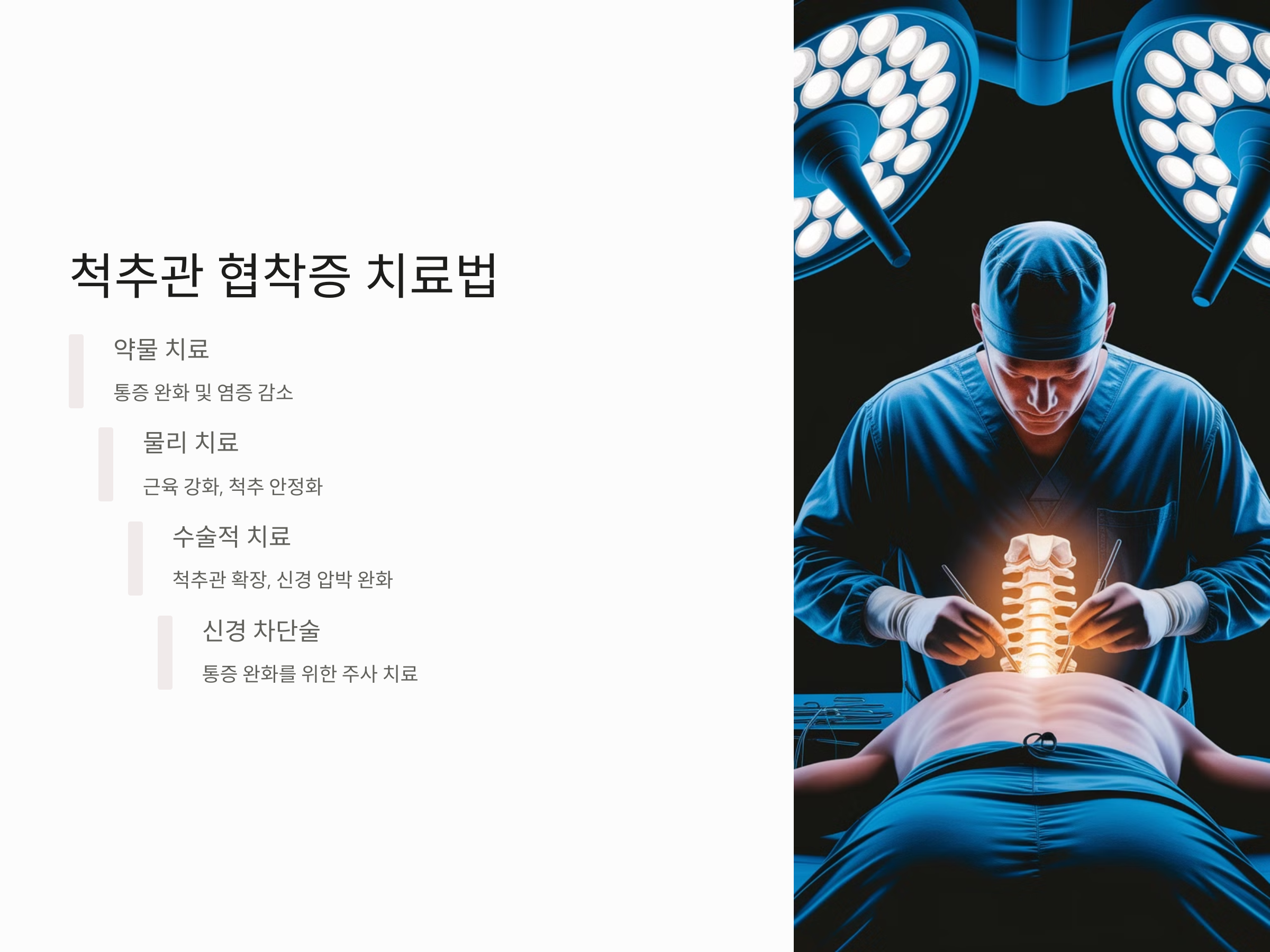 더 심한 경우에는 수술적 치료가 필요할 수 있습니다. 수술 방법으로는 척추관을 넓히는 수술이 있으며, 이 수술은 척추의 뼈나 인대를 제거하여 신경 압박을 완화시키는 방법입니다. 이 외에도 신경 차단술이나 척추 고정술 등이 있습니다.