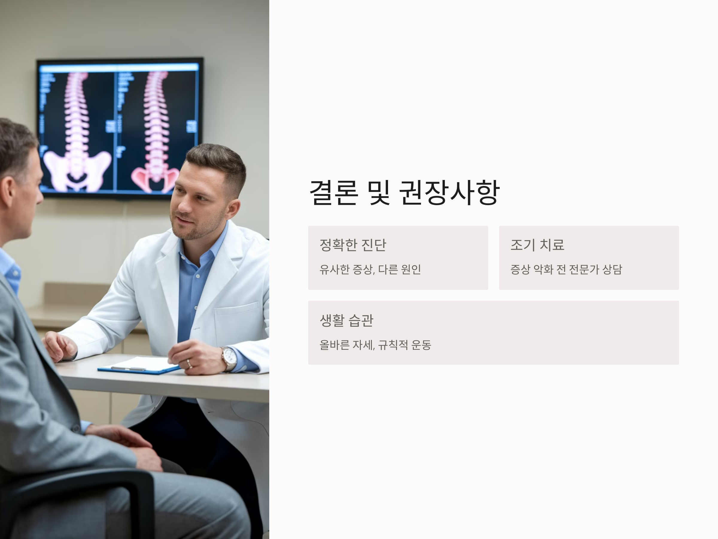 두 질환의 또 다른 차이점은 증상의 발생 위치와 통증의 양상입니다. 좌골신경통은 대개 한쪽 다리에서 강한 통증을 느끼며, 신경이 자극되는 부위에 따라 다리 끝까지 통증이 퍼질 수 있습니다. 이에 반해, 척추관 협착증은 양쪽 다리에서 통증이 발생할 수 있으며, 특히 걷거나 오래 서 있을 때 통증이 심해집니다.