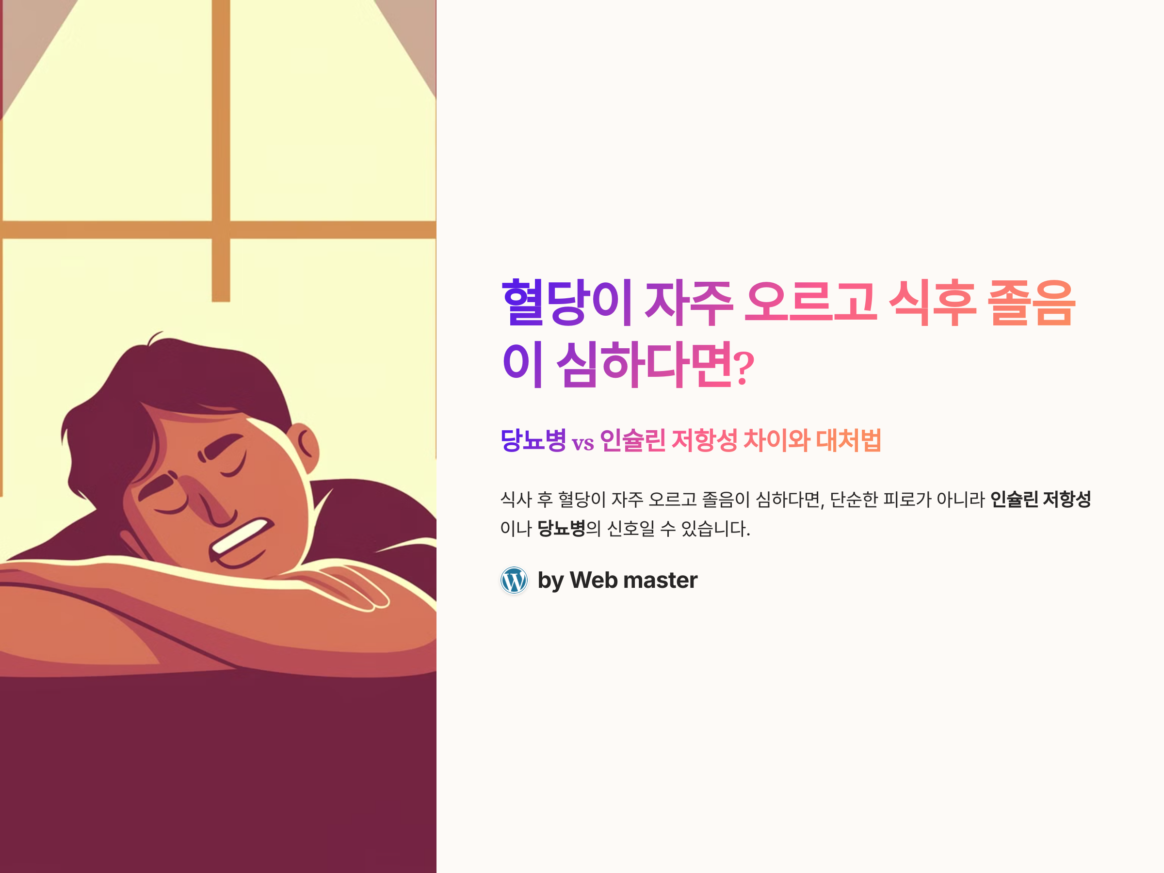 - 혈당이 자주 오르고 식후 졸음이 심하다면 당뇨 전 단계일 가능성이 크므로 식단, 운동, 보충제 섭취 등을 적극적으로 실천해야 합니다.