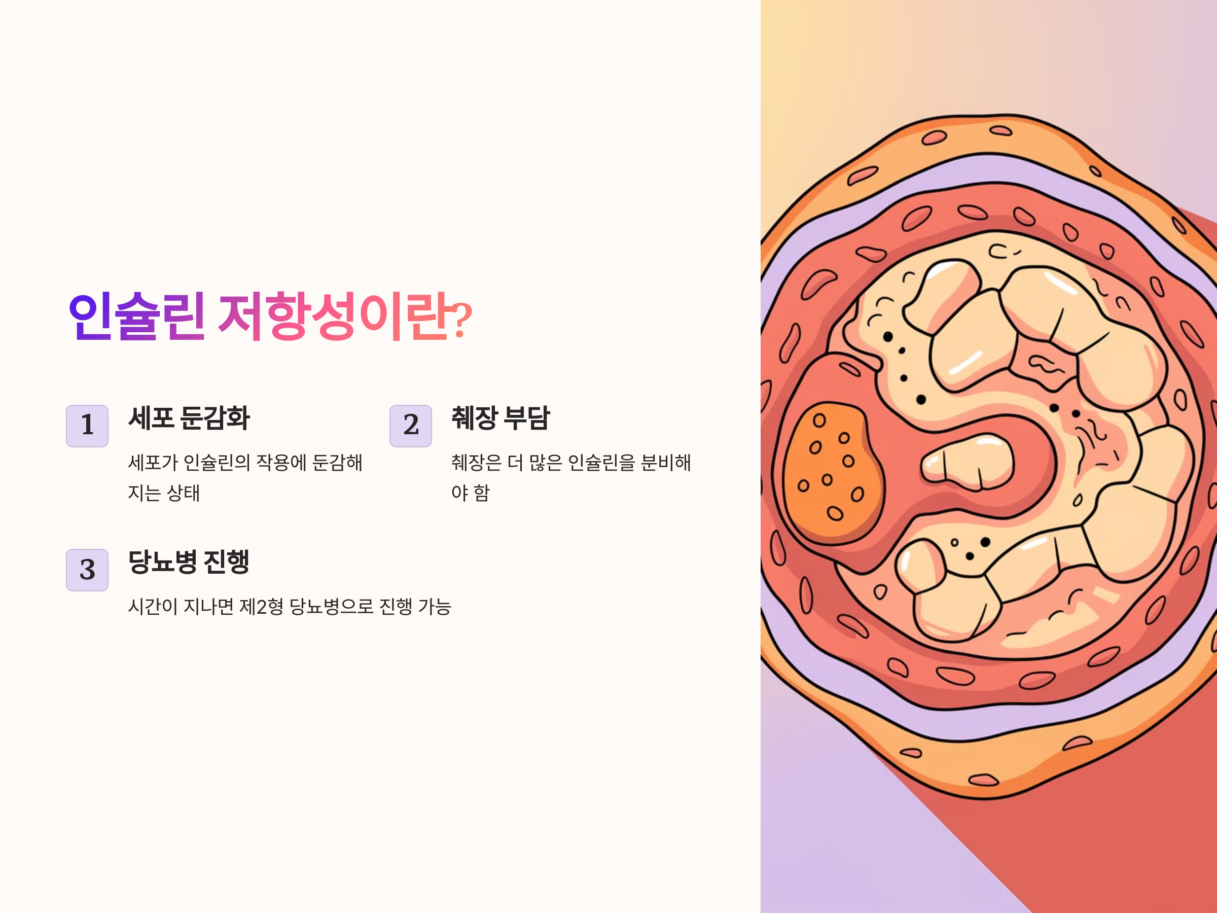 - 인슐린은 혈당을 세포로 이동시키는 역할을 하지만, 저항성이 생기면 같은 양의 인슐린으로도 혈당을 제대로 조절할 수 없습니다.