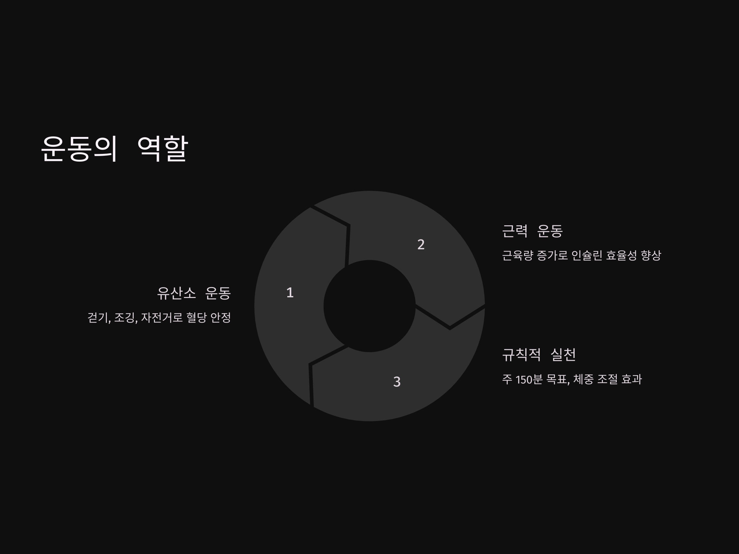 운동은 인슐린 저항성을 개선하고, 당뇨병 예방에 중요한 역할을 합니다. 규칙적인 운동은 근육 세포가 인슐린에 더 잘 반응하도록 도와주며, 혈당을 효율적으로 조절할 수 있게 합니다.