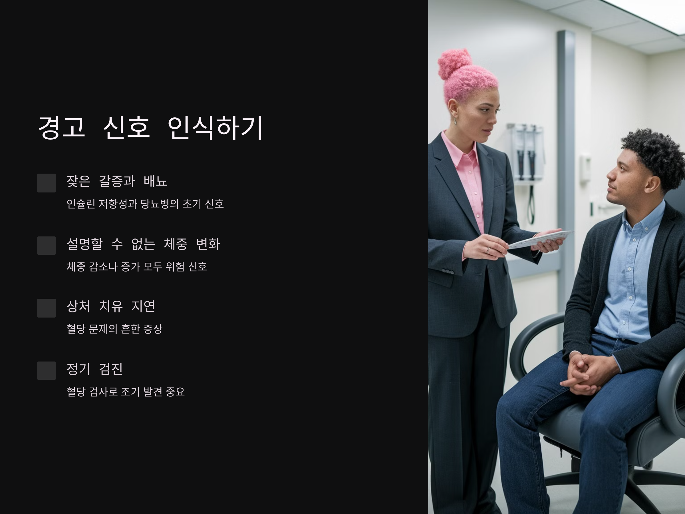 당뇨병과 인슐린 저항성은 둘 다 초기에는 별다른 증상이 없어 예방이 더욱 중요합니다. 혈당 급등과 피로감을 자주 느낀다면, 이는 인슐린 저항성이 있을 가능성을 시사할 수 있으며, 이를 예방하지 않으면 당뇨병으로 발전할 위험이 큽니다.