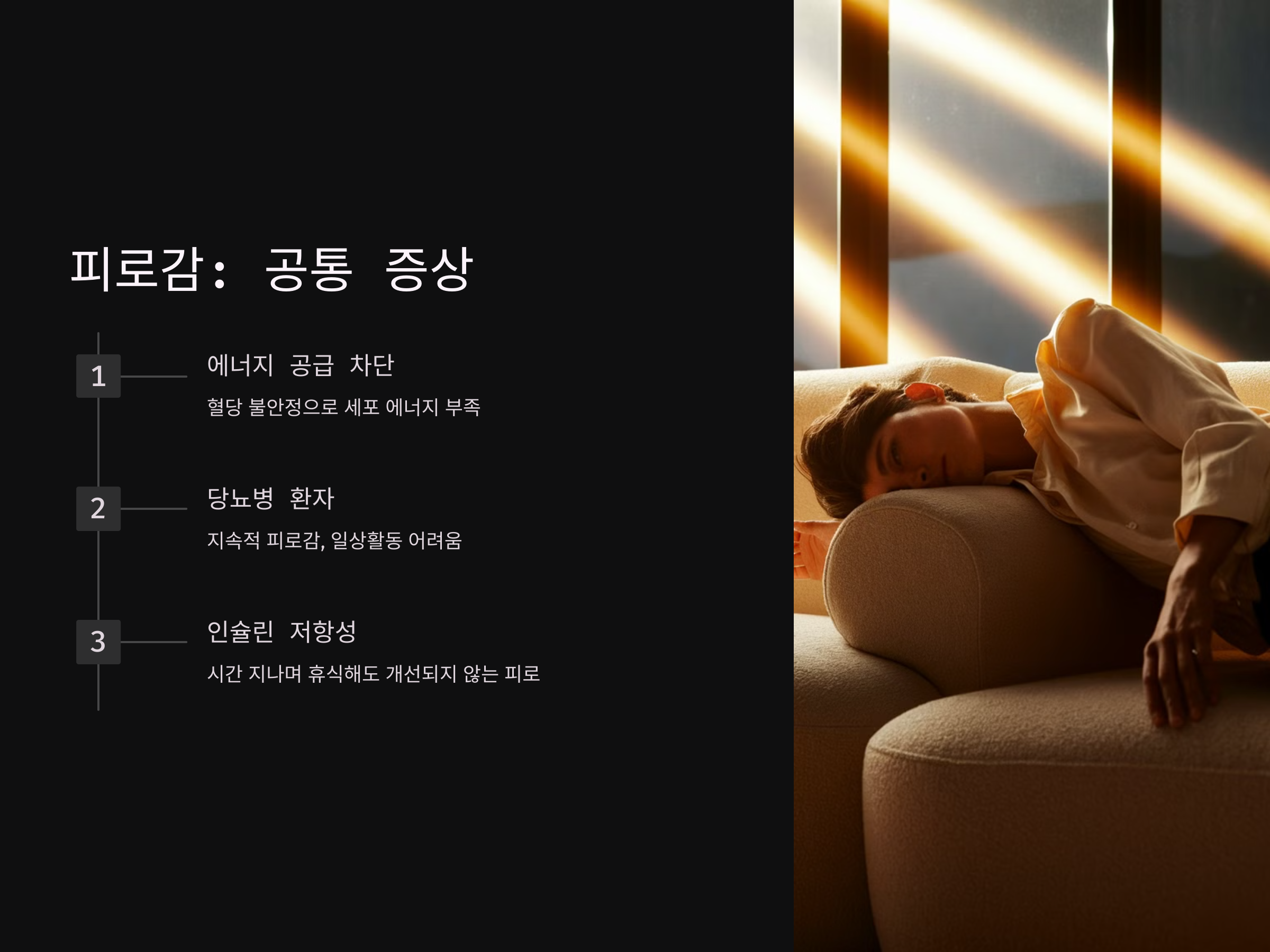 피로감은 당뇨병과 인슐린 저항성에서 공통적으로 나타날 수 있는 증상입니다. 혈당이 급격히 상승하거나 불안정할 때, 신체는 제대로 에너지를 공급받지 못하게 됩니다. 이로 인해 지속적인 피로감을 느끼게 되며, 일상생활에도 큰 지장을 줄 수 있습니다.