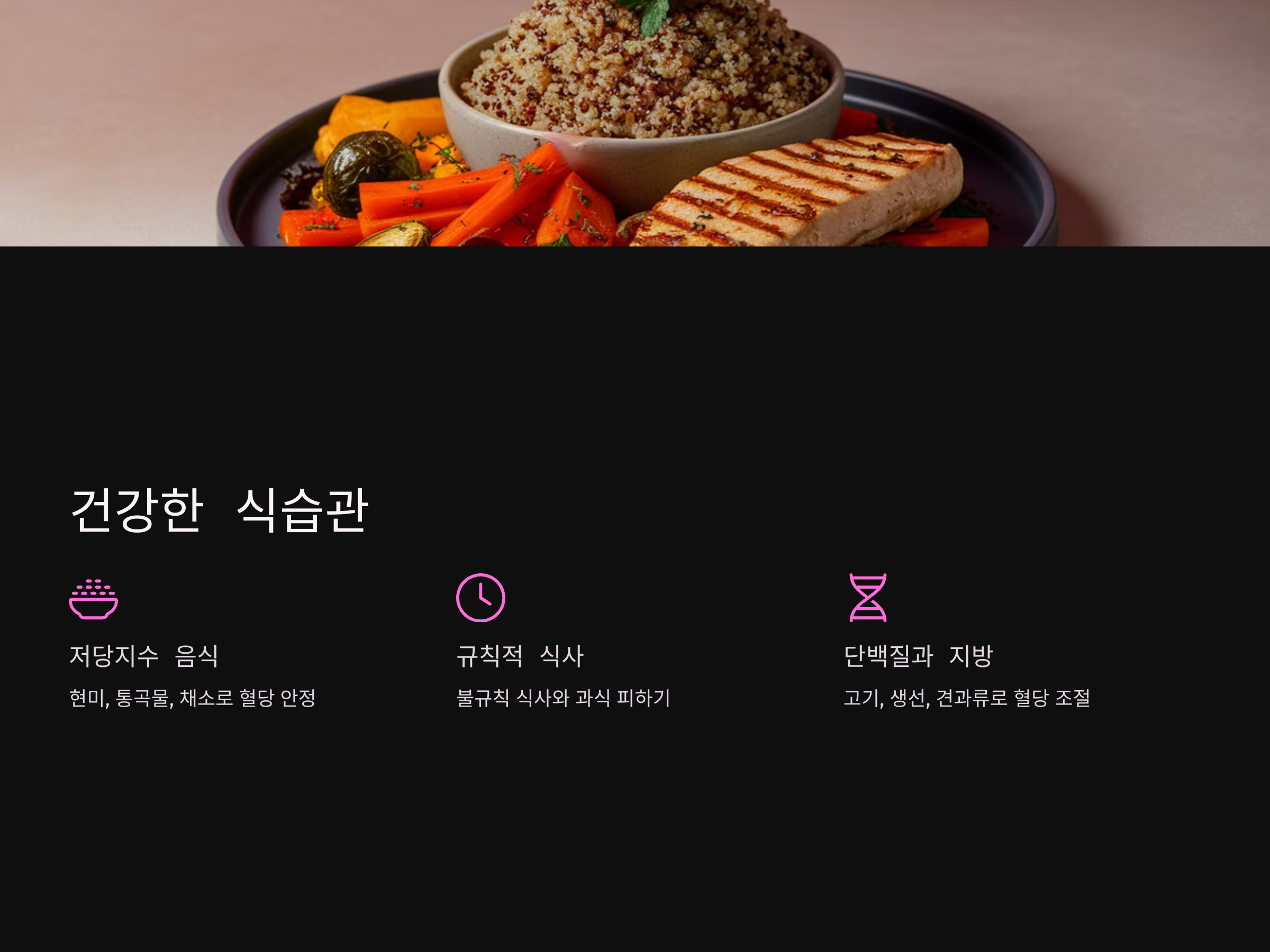 - 식사 시간 규칙화: 식사를 불규칙하게 하거나 과식하면 혈당이 급등할 수 있습니다. 규칙적인 식사 시간을 유지하며, 과식하지 않도록 합니다.