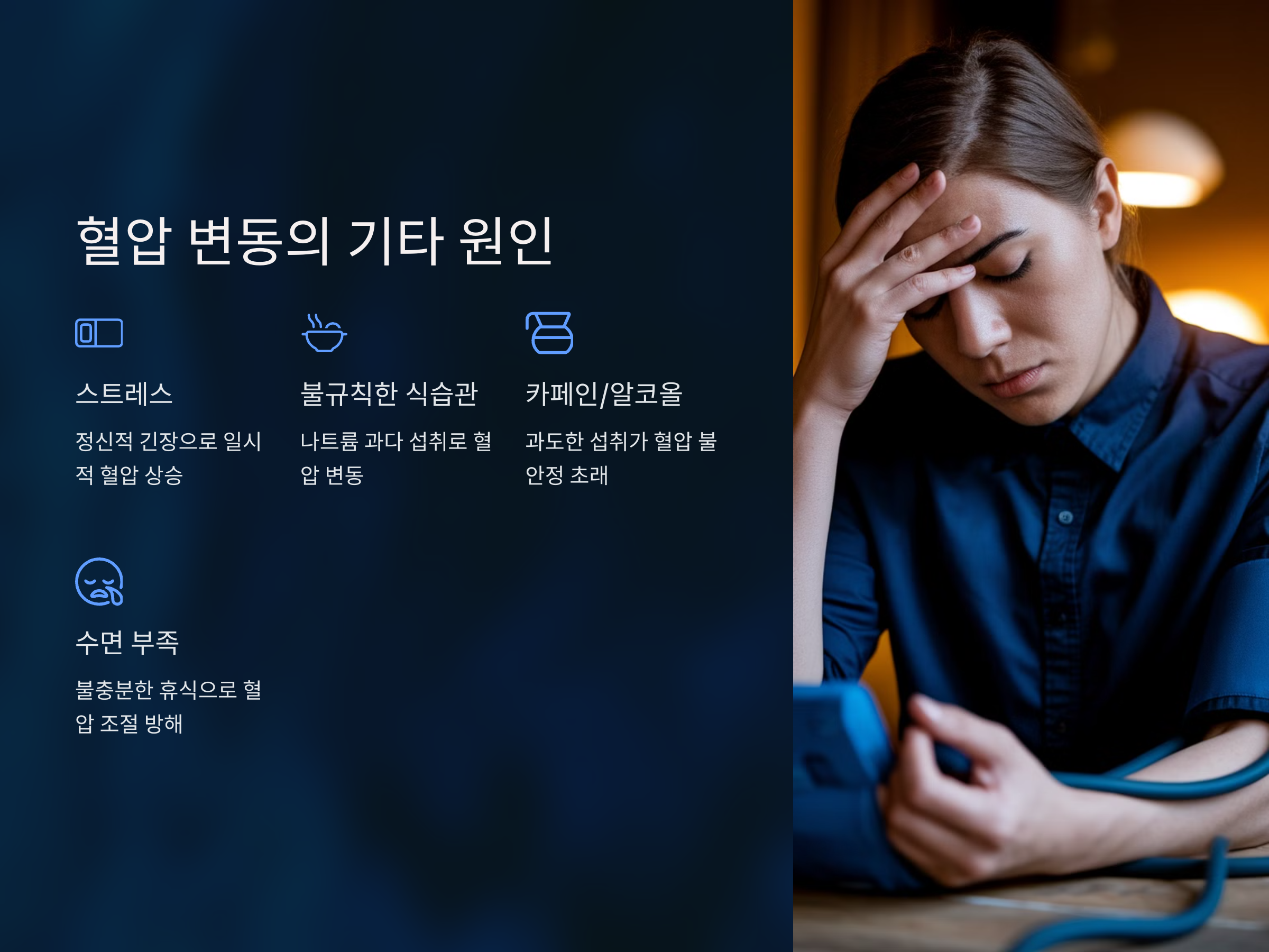 혈압 변동은 부정맥이나 신장 질환 외에도 다양한 요인에 의해 발생할 수 있습니다. 스트레스, 불규칙한 식습관, 과도한 카페인 또는 알코올 섭취, 수면 부족 등이 혈압을 일시적으로 변동시킬 수 있습니다. 이러한 생활습관 요인을 개선함으로써 혈압의 안정성을 높일 수 있습니다.