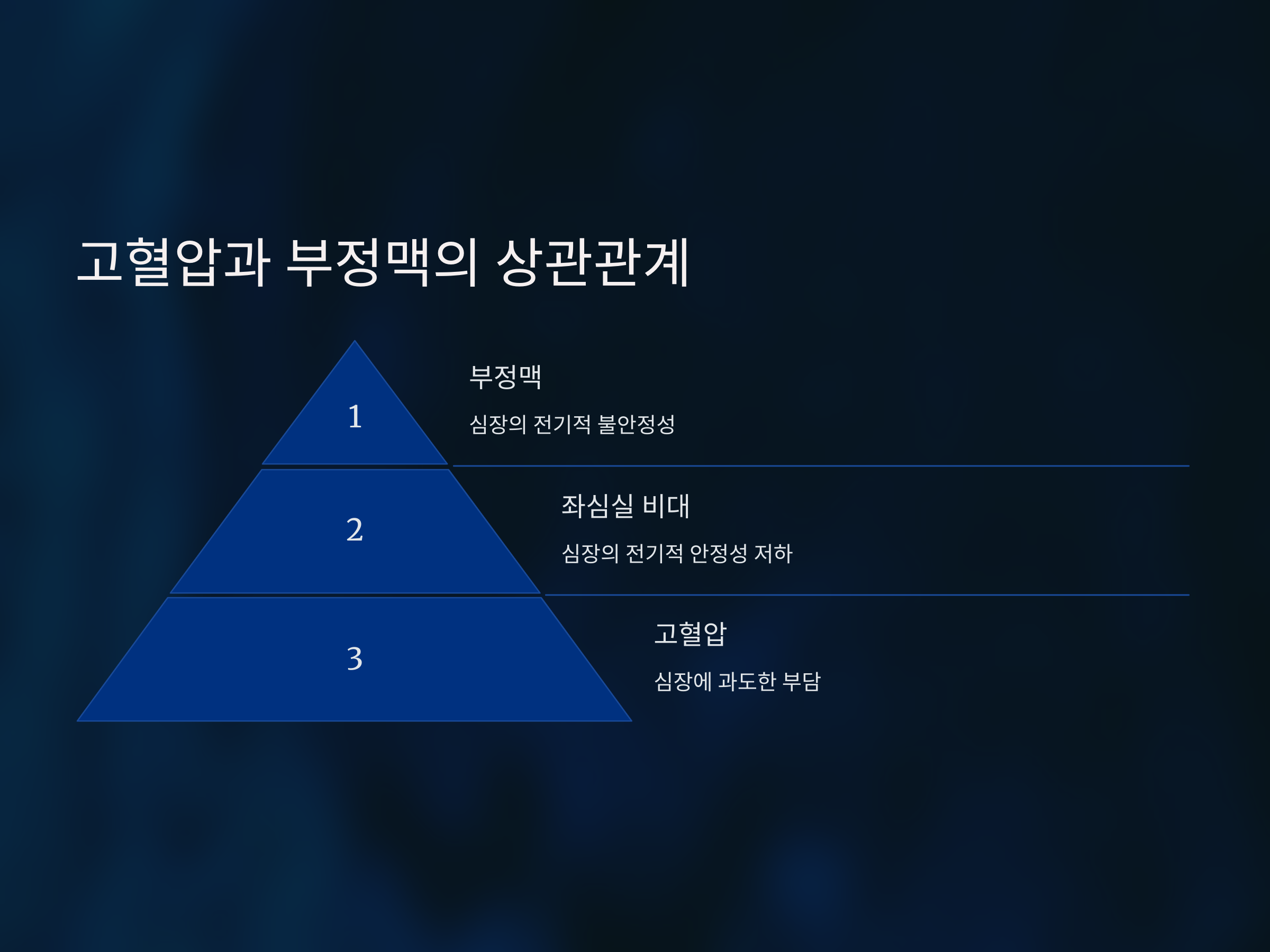 고혈압은 심장에 과도한 부담을 주어 심장비대, 관상동맥질환, 부정맥 등의 심혈관 질환을 유발할 수 있습니다. 특히, 좌심실 비대는 심장의 전기적 안정성을 저하시켜 부정맥 발생 위험을 높입니다. 따라서, 고혈압 환자는 부정맥 발생 여부를 주기적으로 확인하고, 필요 시 적절한 치료를 받아야 합니다. citeturn0search1