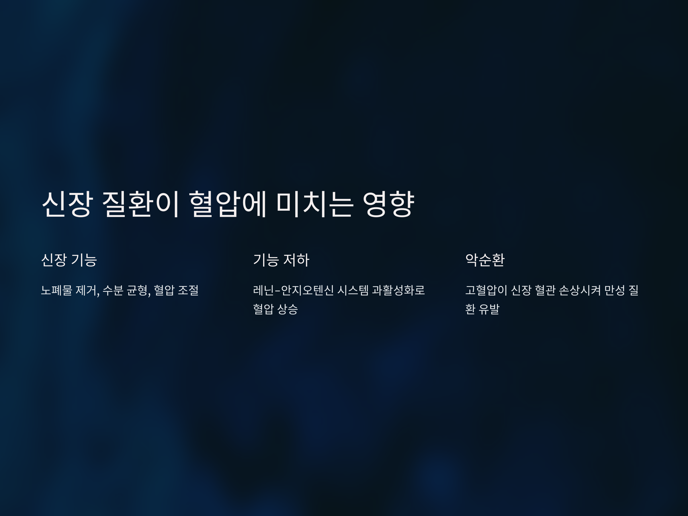 신장은 체내 노폐물을 제거하고 수분 및 전해질 균형을 유지하며, 혈압 조절에도 중요한 역할을 합니다. 신장 기능이 저하되면 레닌-안지오텐신 시스템이 과도하게 활성화되어 혈압이 상승할 수 있습니다. 또한, 고혈압은 신장의 혈관을 손상시켜 만성 신장 질환으로 이어질 수 있습니다. 이러한 악순환을 방지하기 위해서는 신장 기능을 정기적으로 확인하고, 혈압을 철저히 관리하는 것이 중요합니다. citeturn0search0