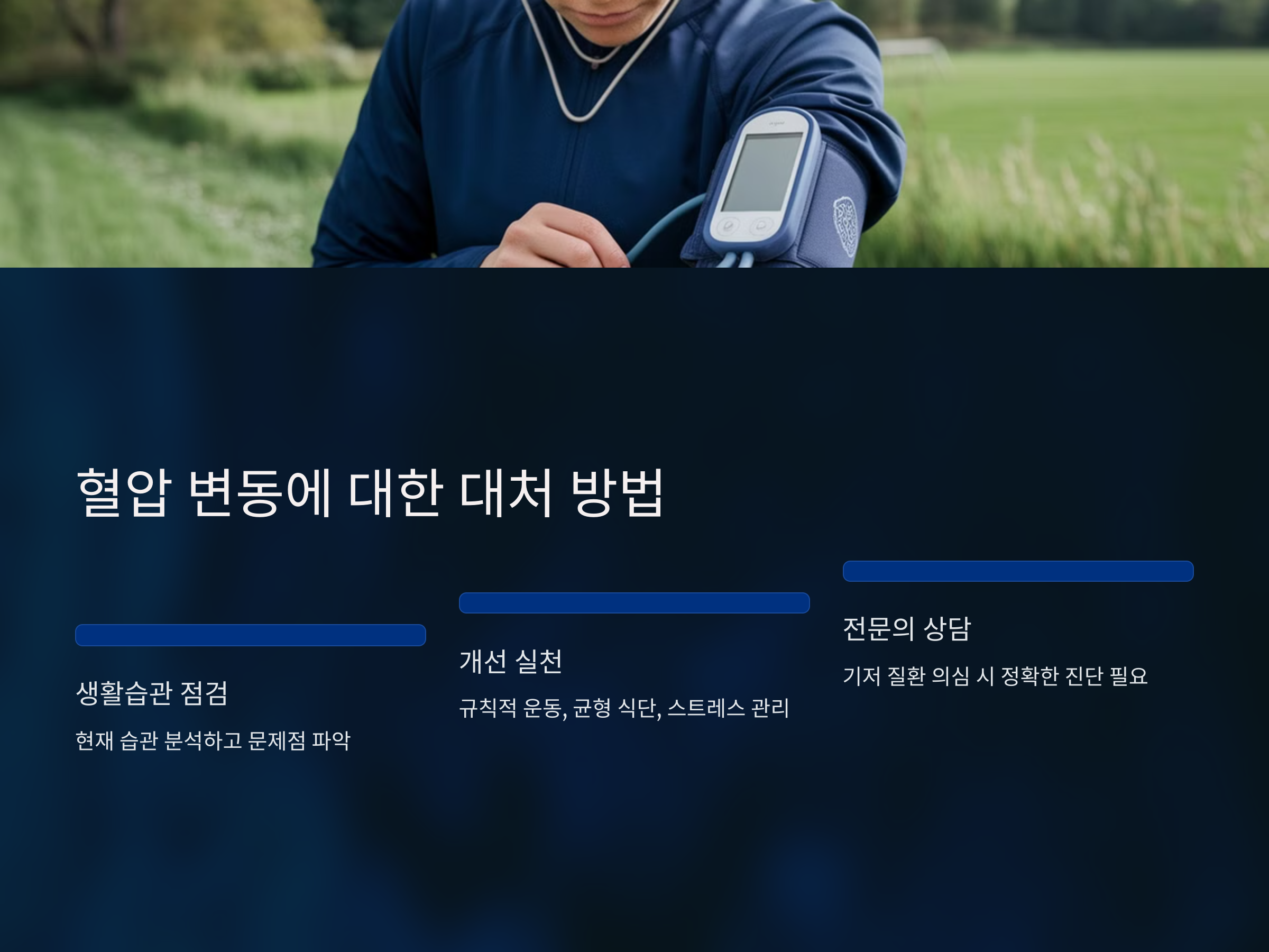 혈압이 불규칙하게 변동하는 경우, 먼저 생활습관을 점검하고 개선하는 것이 중요합니다. 규칙적인 운동, 균형 잡힌 식단, 스트레스 관리, 충분한 수면 등이 도움이 될 수 있습니다. 또한, 부정맥이나 신장 질환과 같은 기저 질환이 의심되는 경우, 전문 의료진과 상담하여 정확한 진단과 치료를 받는 것이 필요합니다.