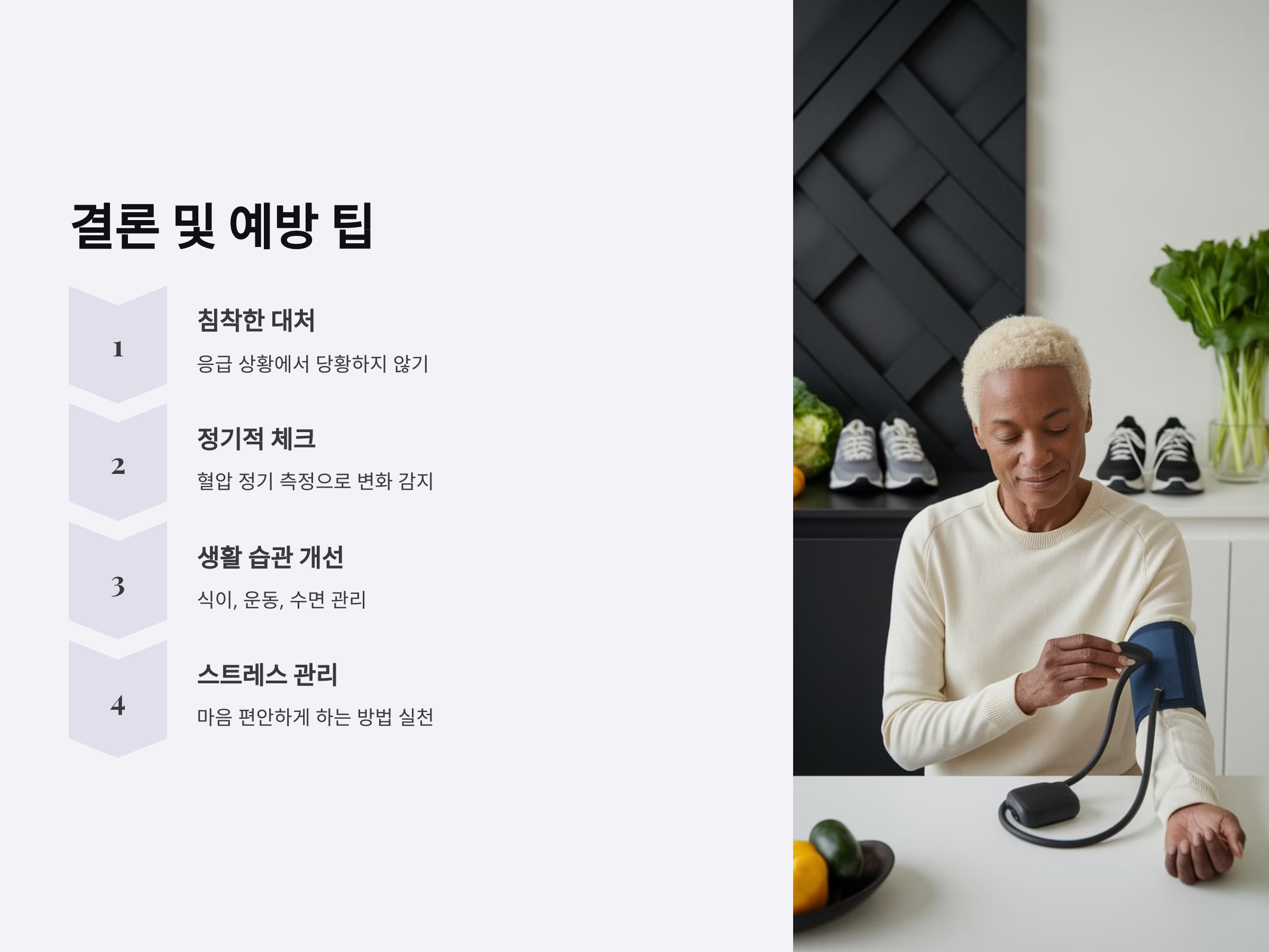 혈압 급상승을 예방하려면 평소 건강한 생활 습관을 유지해야 합니다.