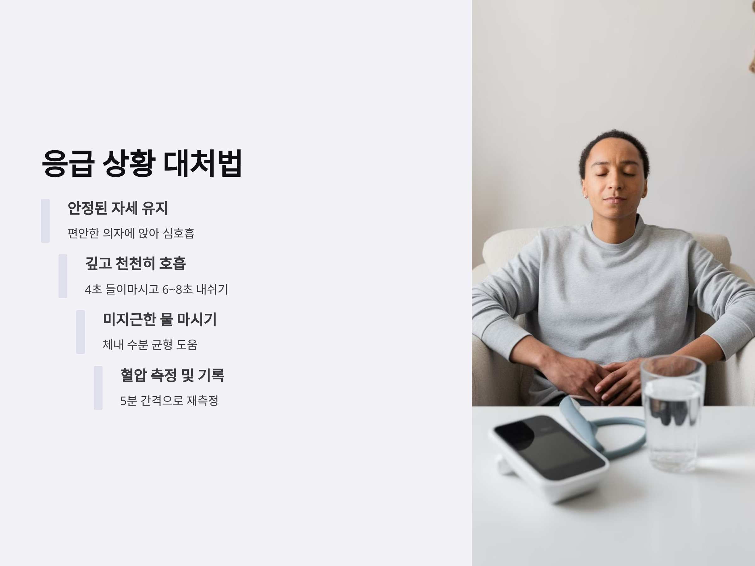 혈압이 갑자기 상승했을 때 당황하지 말고 아래 방법을 따라 침착하게 대응하는 것이 중요합니다.