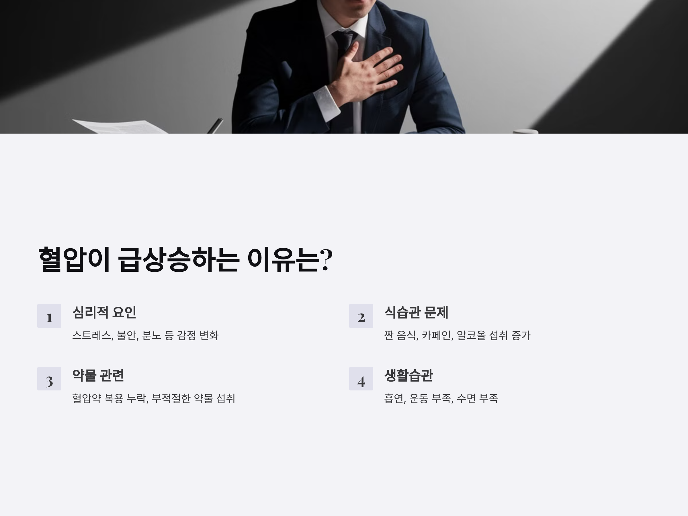 이러한 원인을 미리 파악하고 조절하는 것이 중요하며, 갑작스러운 혈압 상승을 예방하는 데 도움이 됩니다.
