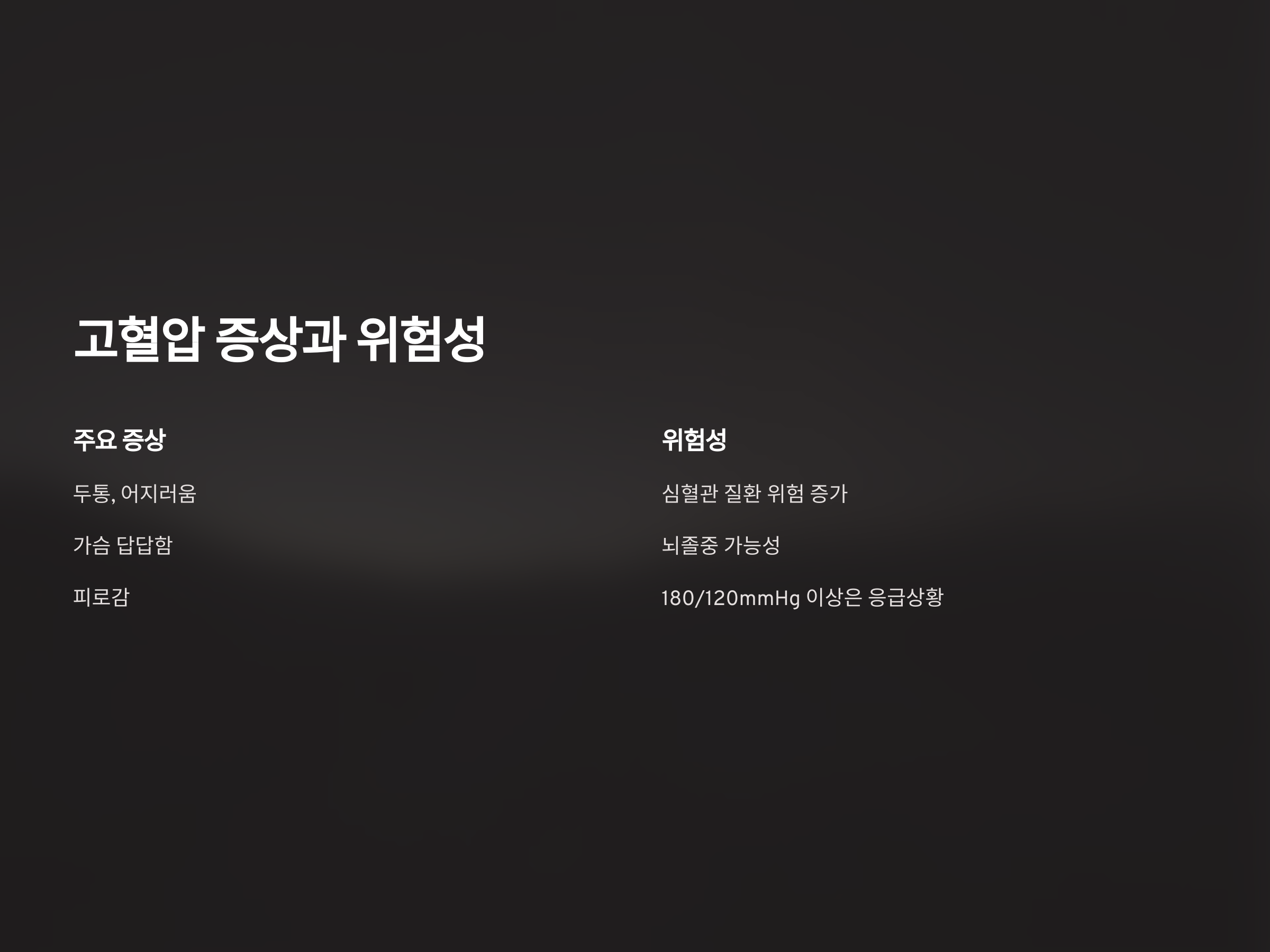 - 혈압이 갑자기 상승하면 두통, 어지러움, 피로감이 나타날 수 있습니다.