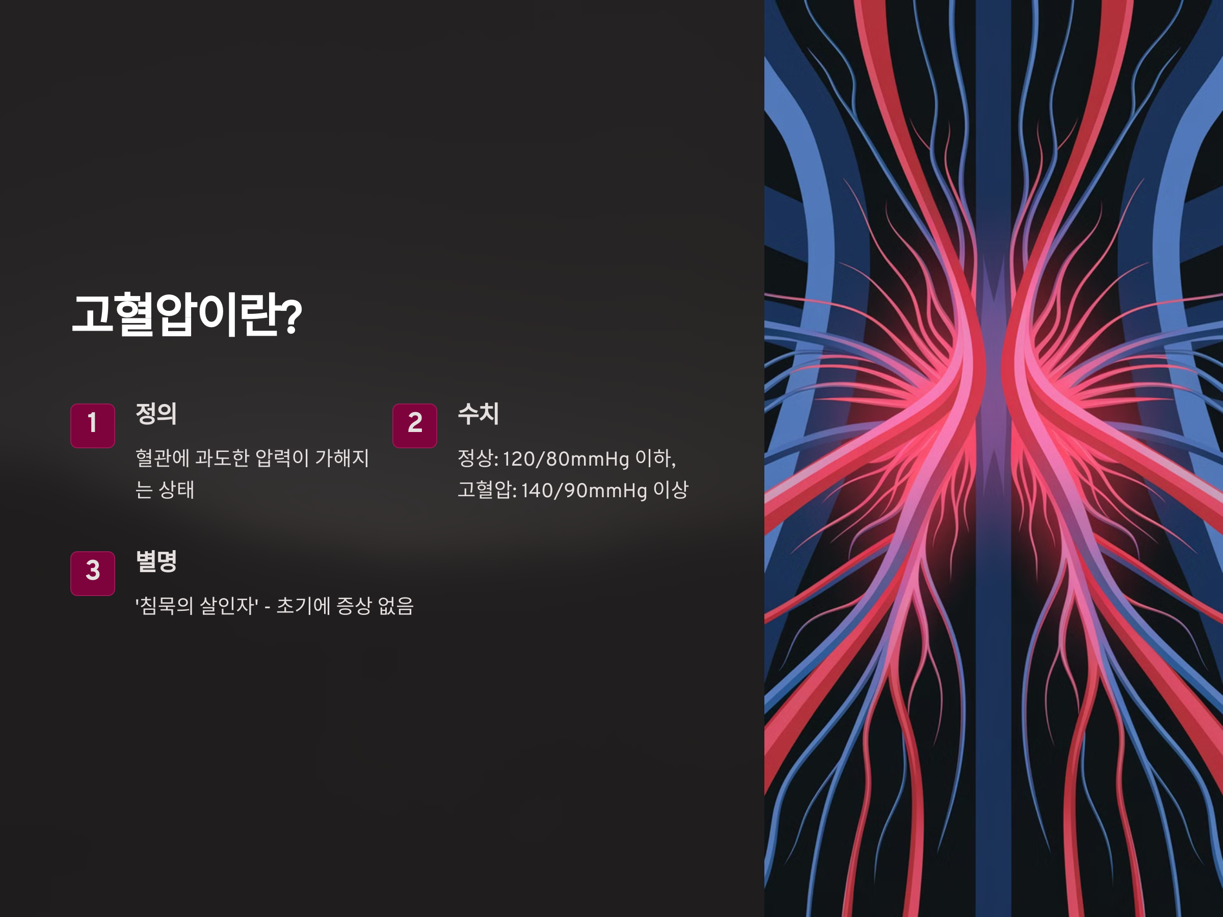 고혈압은 혈관에 과도한 압력이 가해지는 상태를 말합니다. 정상적인 혈압은 120/80mmHg 이하로 유지되어야 하지만, 고혈압은 140/90mmHg 이상의 수치로 정의됩니다. 혈압이 지속적으로 높은 상태가 되면 심장, 뇌, 신장 등 여러 기관에 부담을 주어 각종 합병증을 일으킬 수 있습니다.
