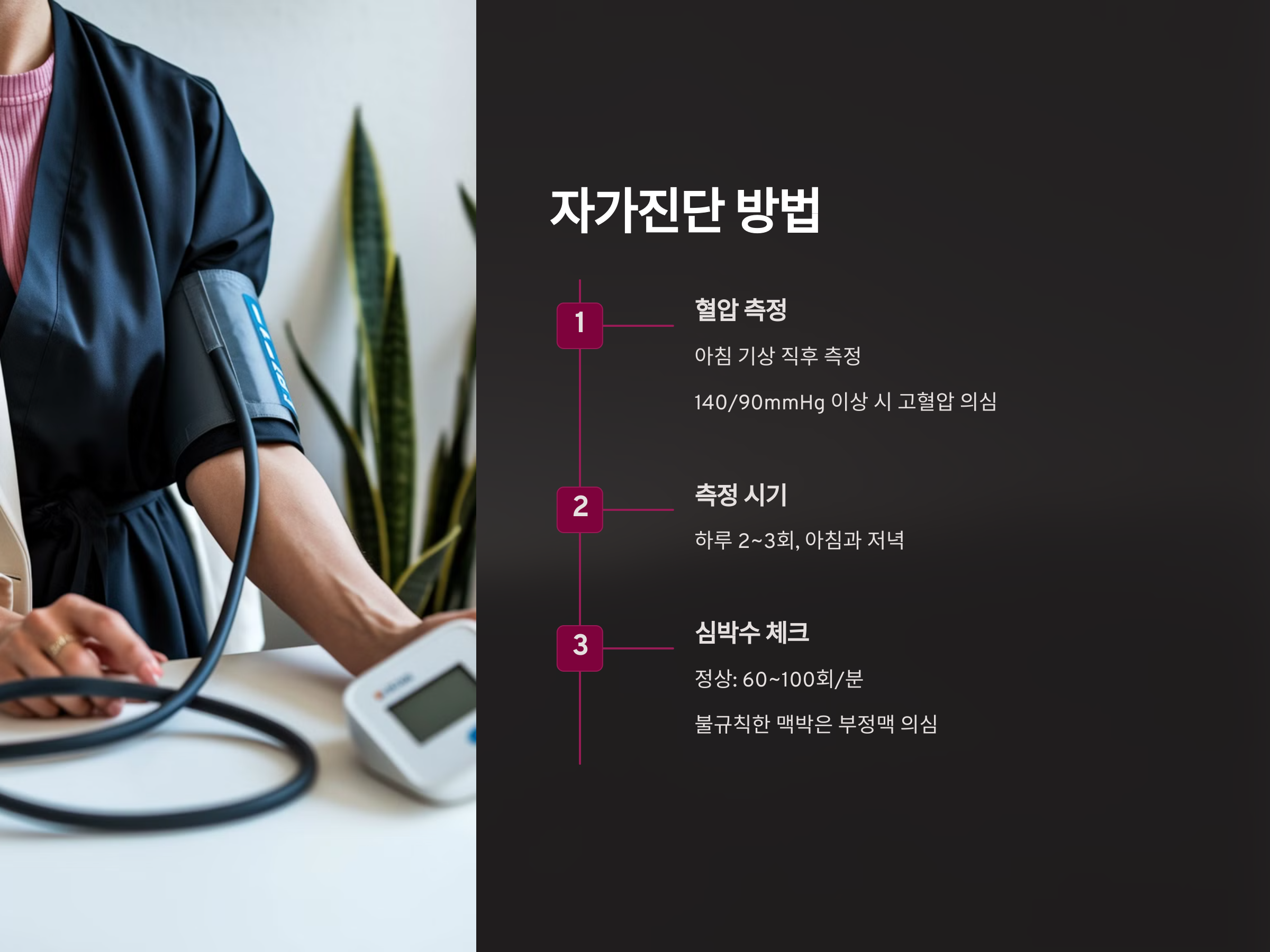 혈압과 심박수는 자가진단을 통해 일정 부분 확인할 수 있습니다. 혈압을 측정할 때는 아침에 일어나자마자, 식사를 하지 않은 상태에서 측정하는 것이 가장 정확합니다. 또한 심박수는 1분 동안 심장 박동을 세어보는 방법으로 체크할 수 있습니다.