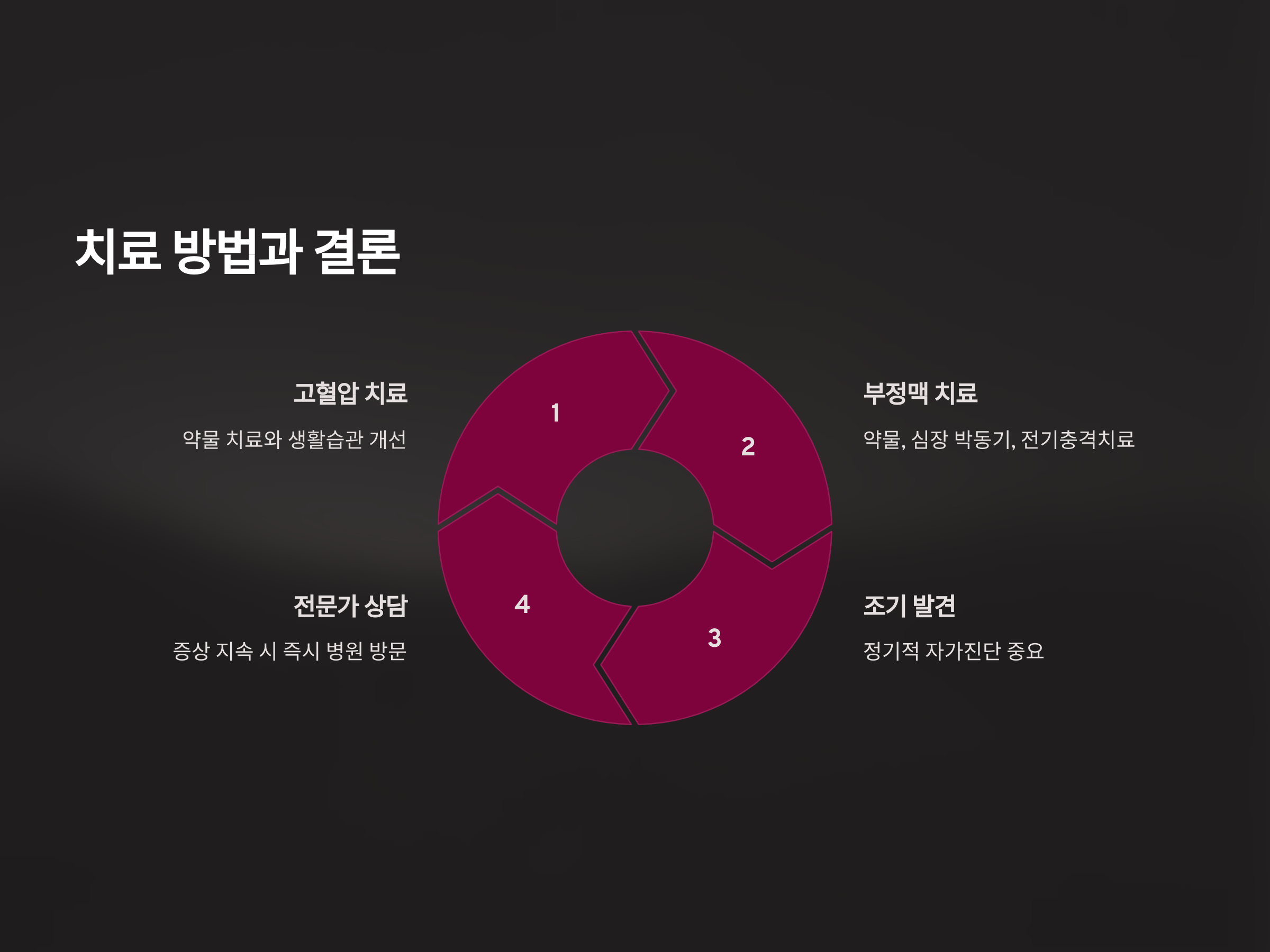 고혈압은 생활습관 개선과 약물 치료로 조절이 가능하며, 부정맥은 각종 치료 방법이 필요합니다. 무엇보다 중요한 것은 조기 발견과 예방입니다. 스스로 건강을 체크하고, 적절한 관리와 치료를 통해 합병증을 예방하세요.