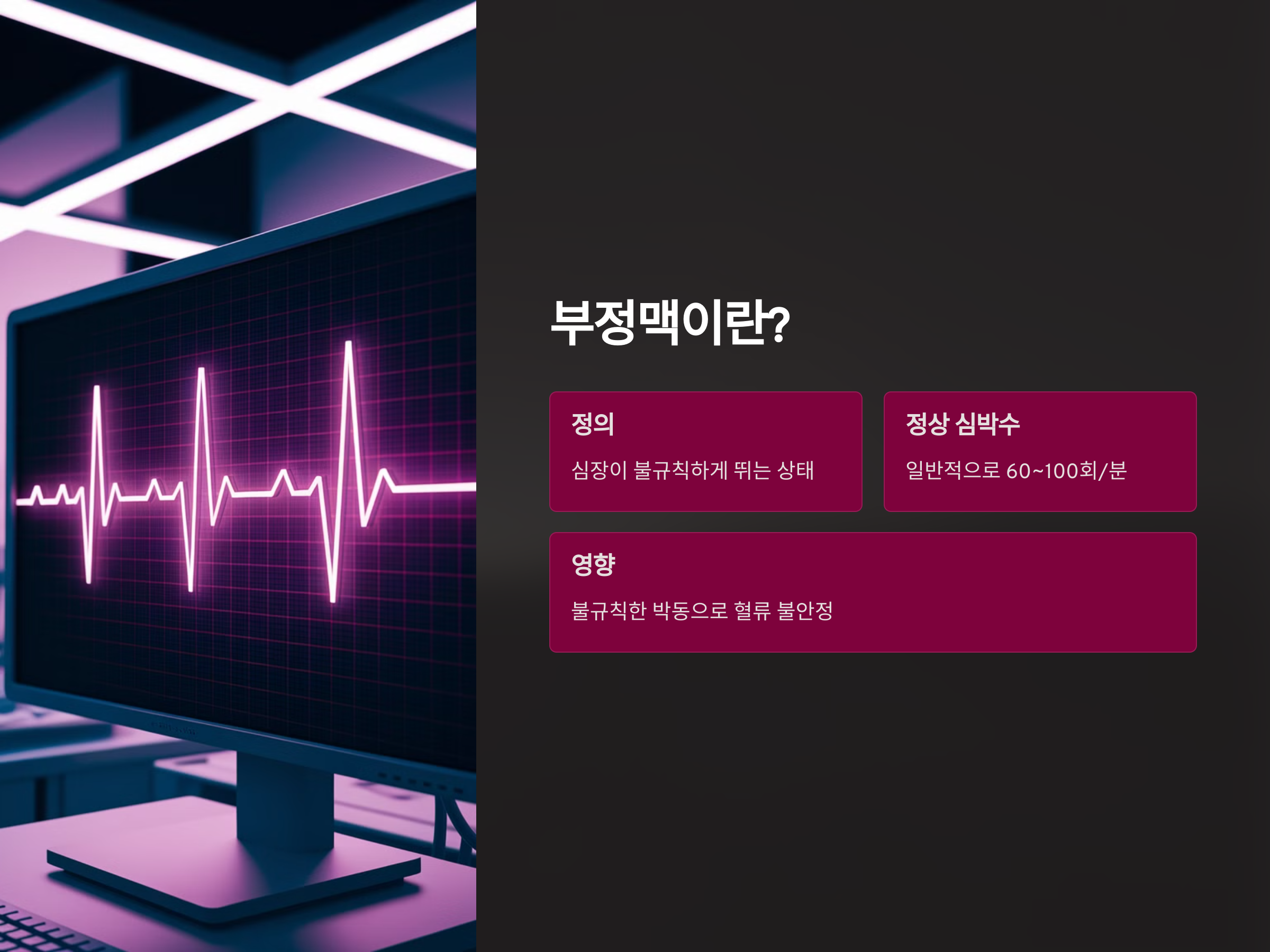 부정맥은 심장이 정상적으로 뛰지 않고 불규칙하거나 지나치게 빠르거나 느리게 뛰는 상태를 말합니다. 심장은 일반적으로 60~100회의 규칙적인 박동을 하지만, 부정맥이 발생하면 박동이 불규칙하고 이로 인해 혈류가 원활하게 흐르지 않습니다.