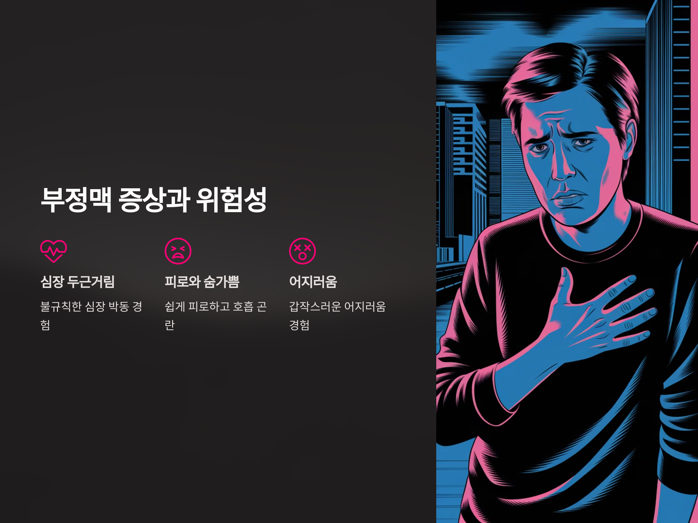 부정맥의 증상은 혈압 변동과 두통 외에도 심한 피로, 가슴 통증, 숨 가쁨, 심장이 두근거리는 느낌 등이 있습니다. 특히 가슴이 두근거리거나 심장이 멈추는 듯한 느낌이 자주 나타난다면, 부정맥을 의심할 수 있습니다. 또한 갑자기 어지럽거나, 심장 박동이 매우 빠르거나 느려지는 경험이 있다면 바로 전문의를 찾아야 합니다.