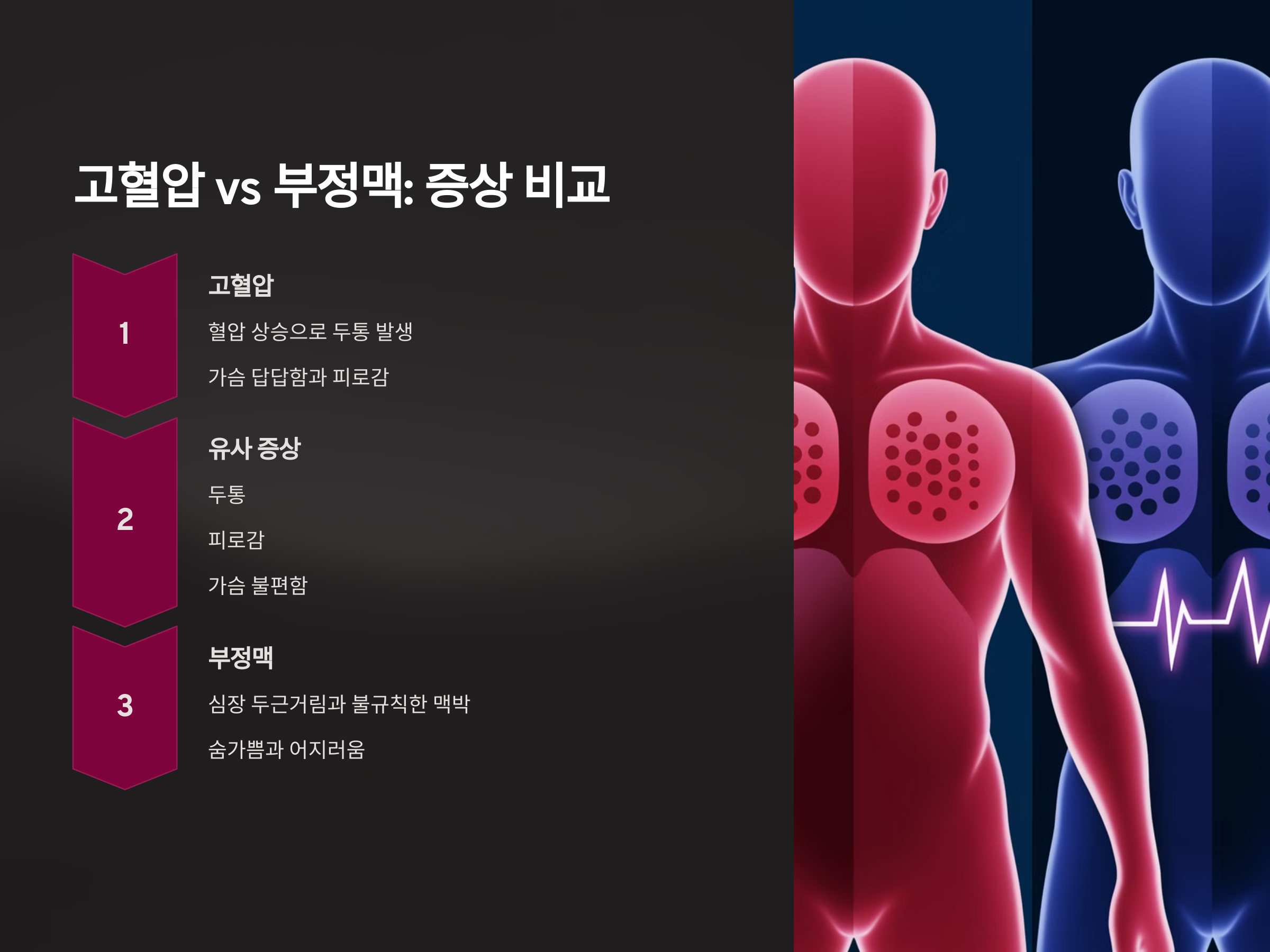 고혈압과 부정맥은 두 가지 모두 두통이나 가슴 답답함 같은 유사한 증상을 보일 수 있습니다. 하지만 이 두 가지 질환은 각기 다른 원인과 증상을 가지고 있기 때문에 구분이 중요합니다.